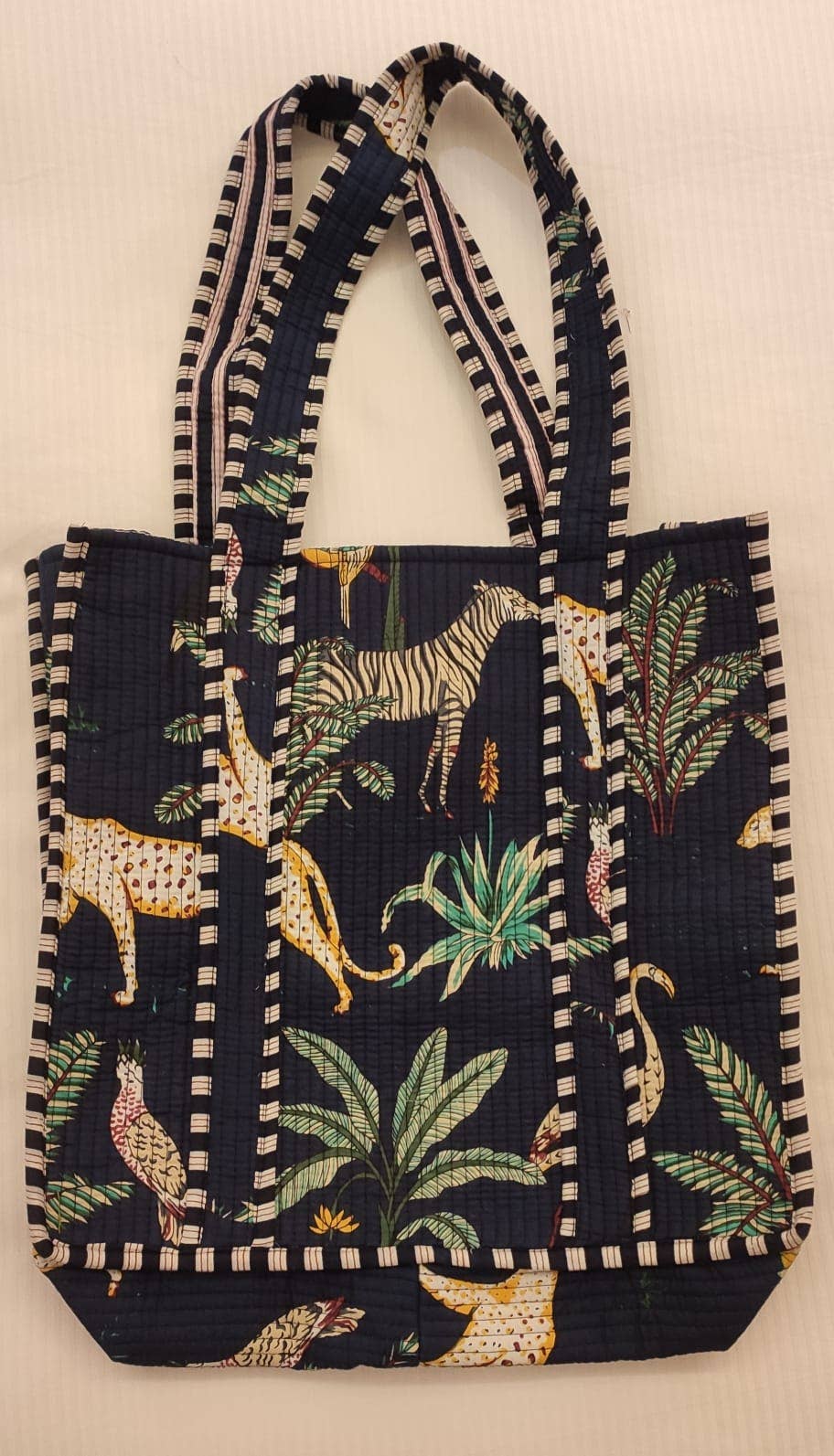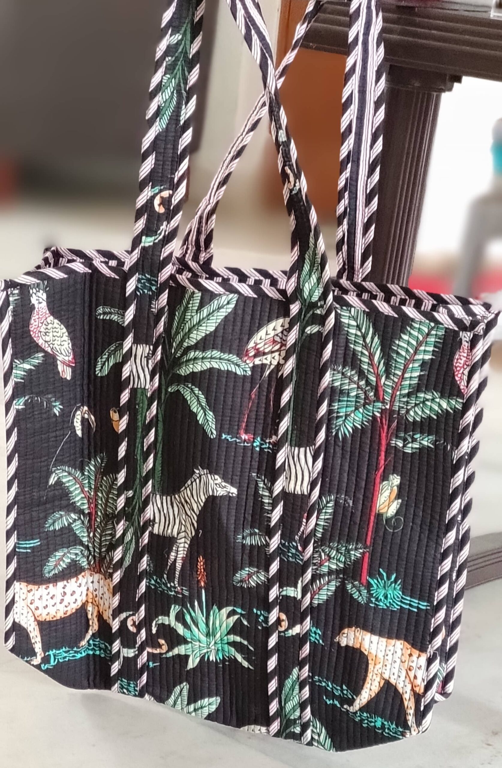 Take a trip on the wild side with our Black Safari Cotton Quilted Tote Bag!