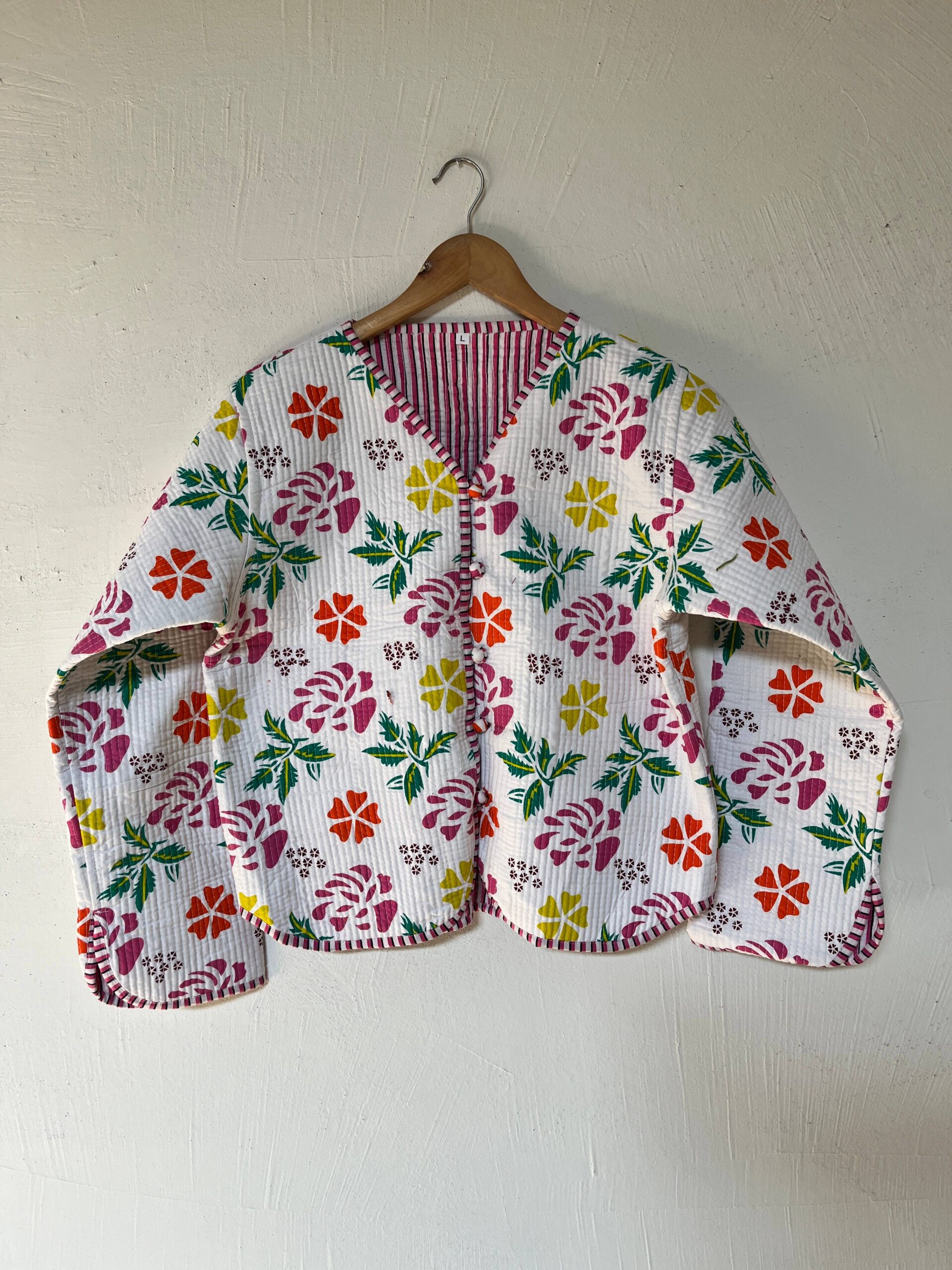 Crafted from high-quality cotton, our reversible quilted jacket has two front pockets, and handmade cotton buttons. The jacket is fully reversible, featuring a solid color/striped fabric on the inside, allowing you to switch up your look depending on your mood or outfit.