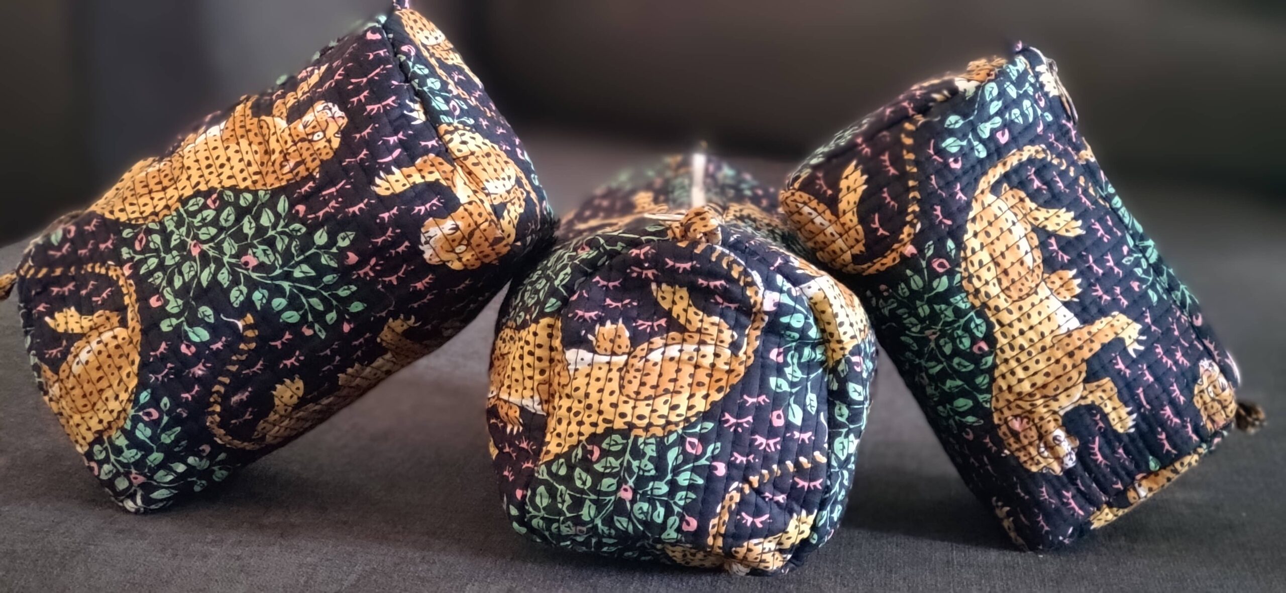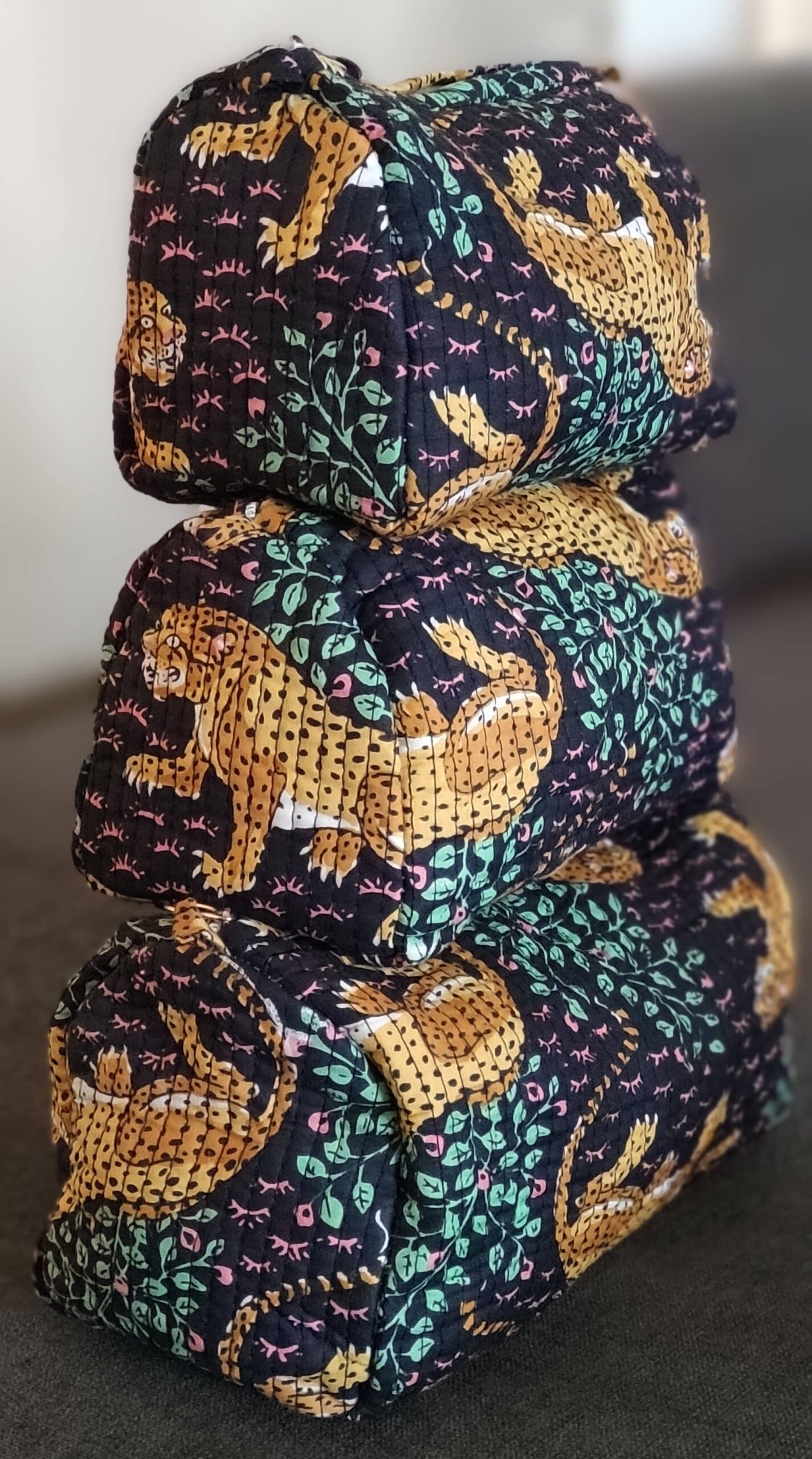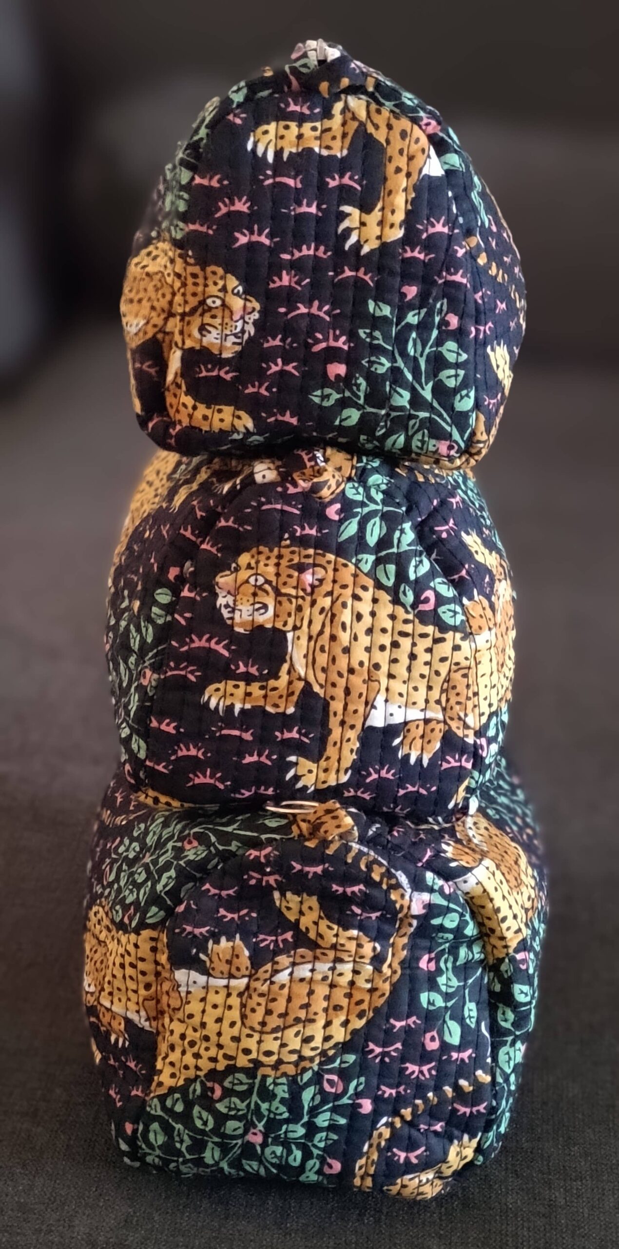 Bold and sophisticated, our Blue Safari Quilted Bag Set features a striking leopard motif on a deep blue base, accented with soft green foliage. Handcrafted from premium cotton, each bag is quilted for structure and lined with waterproof fabric for everyday practicality.
