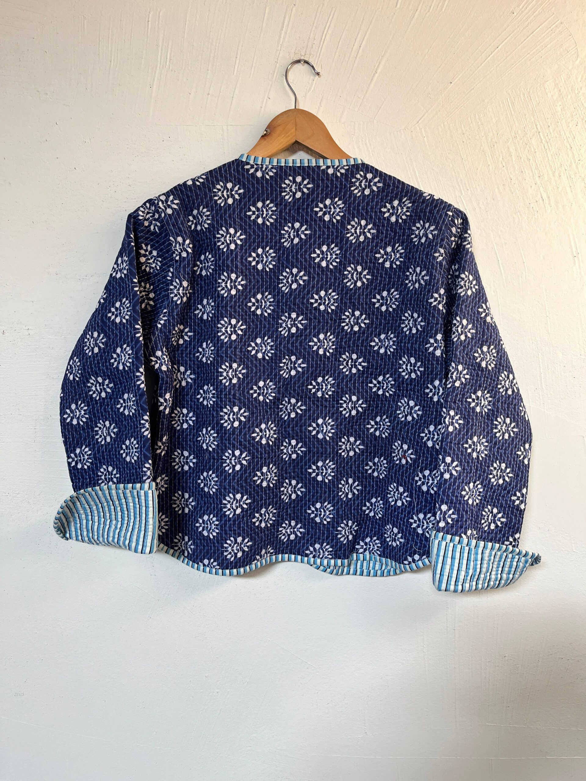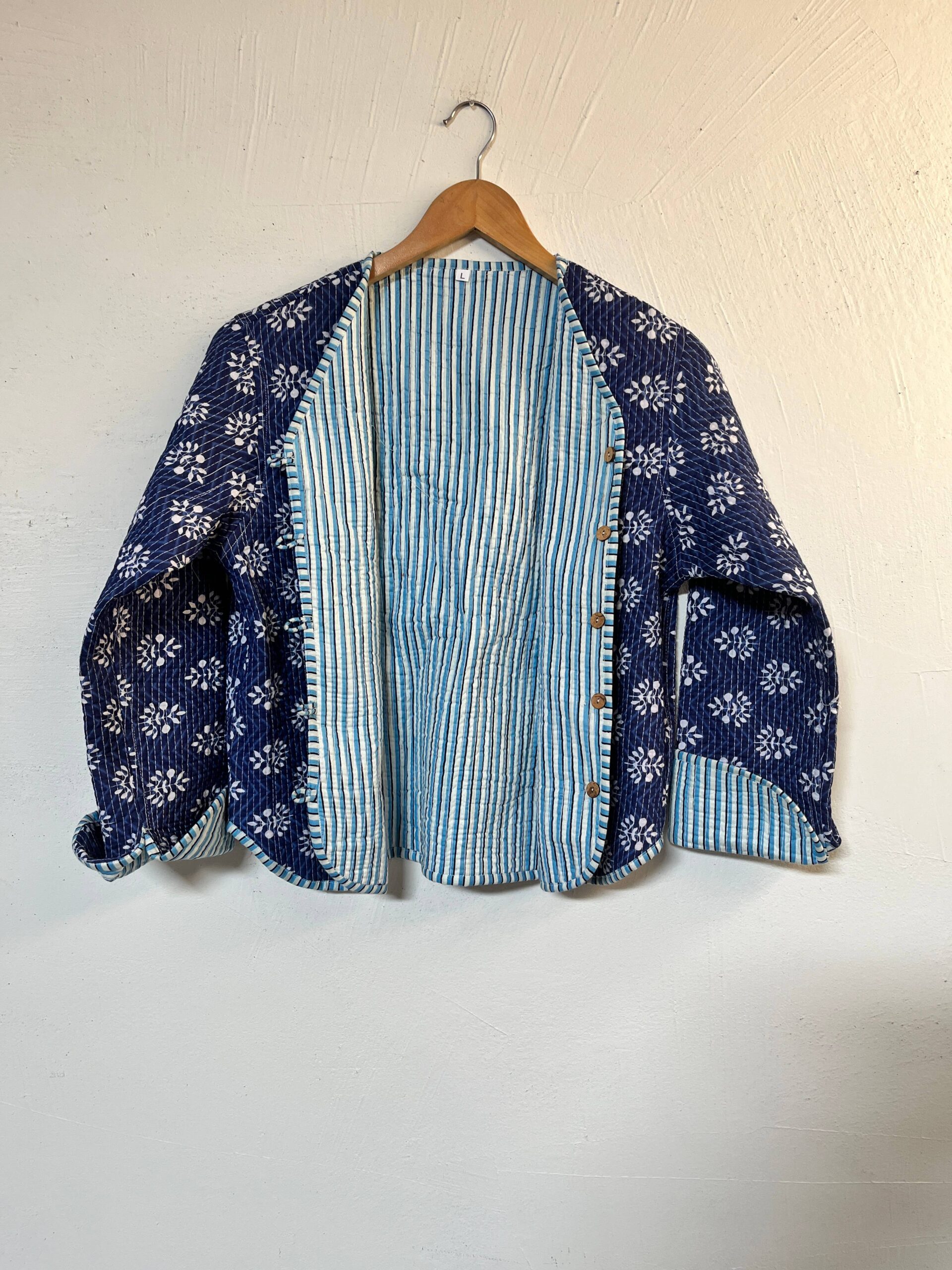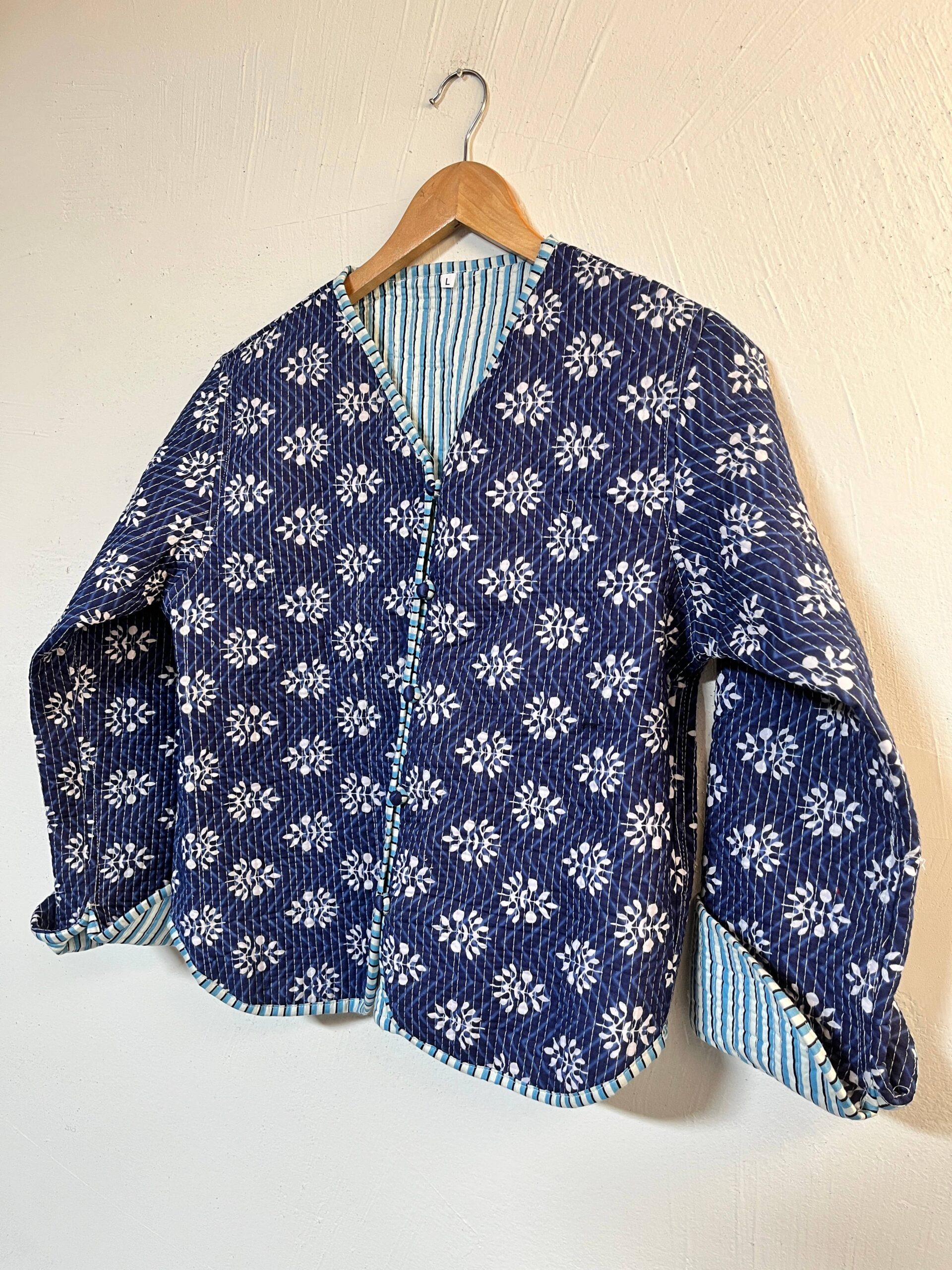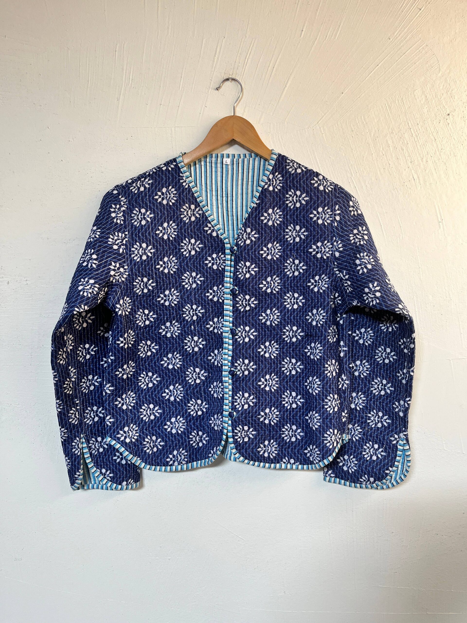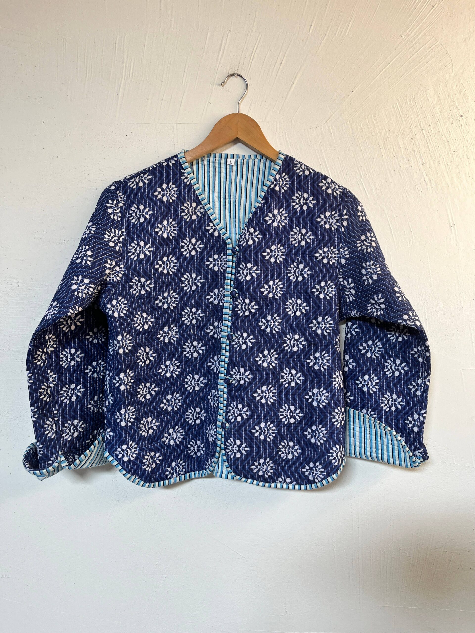 Effortlessly stylish and versatile, our Dahlia Reversible Cotton Jacket offers two looks in one. Handcrafted from soft, breathable cotton, it features a charming hand-block floral print on one side and classic stripes on the other.