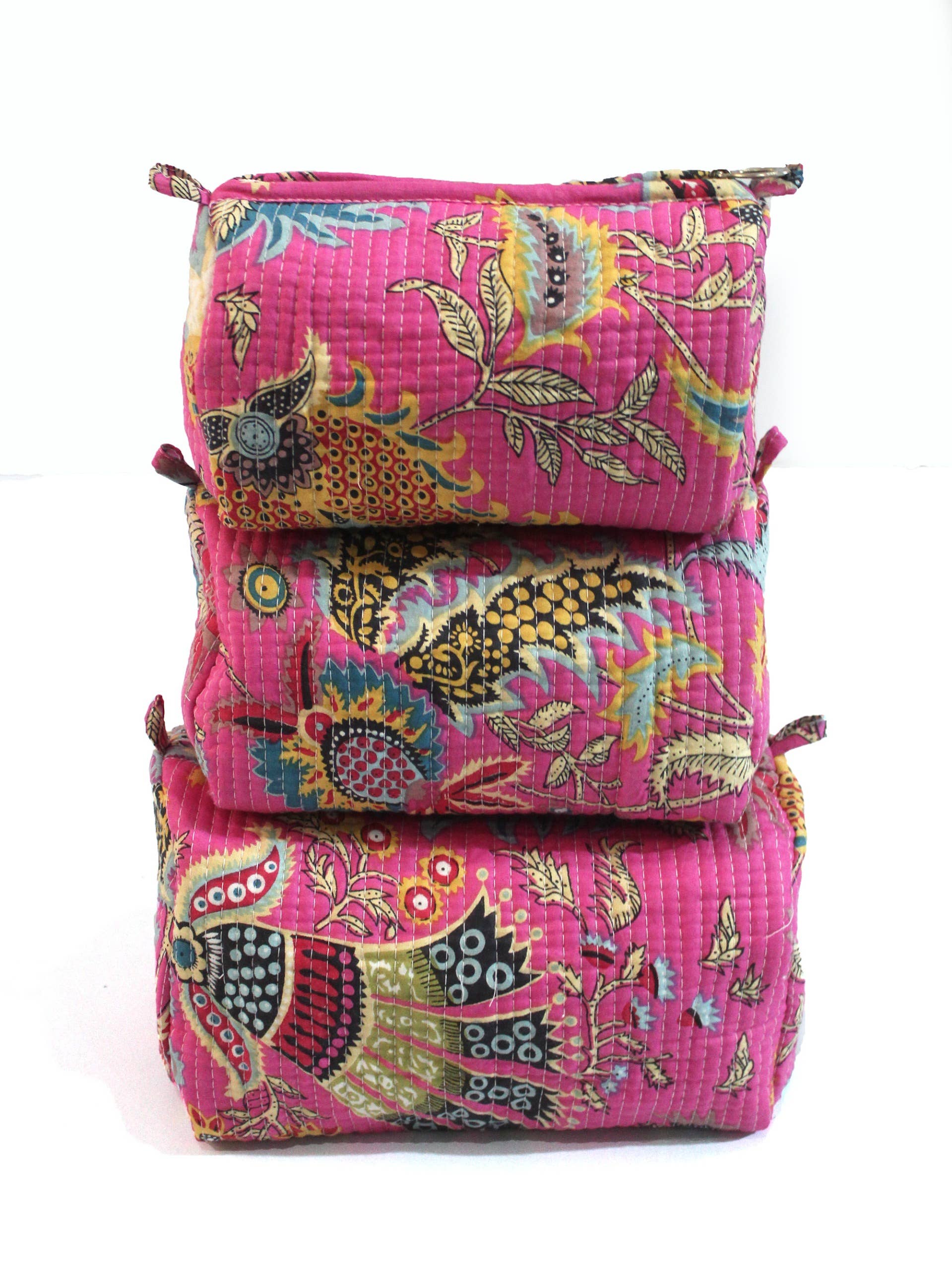 Vibrant and versatile, our Fuchsia Bloom Quilted Bag Set adds a pop of color to your travel or vanity collection. Printed on soft cotton with intricate floral and bird motifs, each bag is quilted for structure and lined with waterproof fabric.