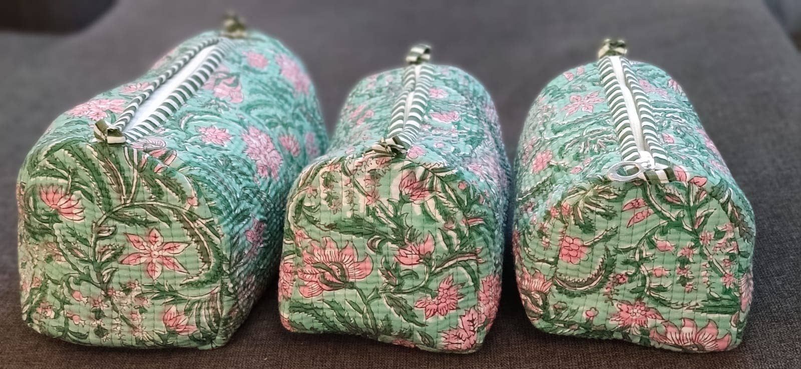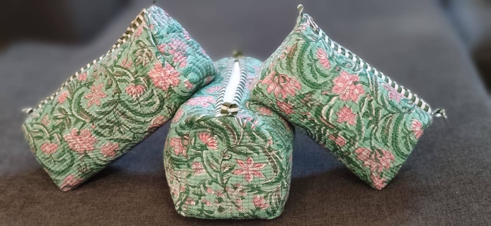 Add a touch of botanical beauty to your travels with our Green Floral Quilted Cotton Makeup Bags. Crafted from soft cotton with a floral design in soothing green and pink tones, these pouches bring elegance and charm to everyday organization.