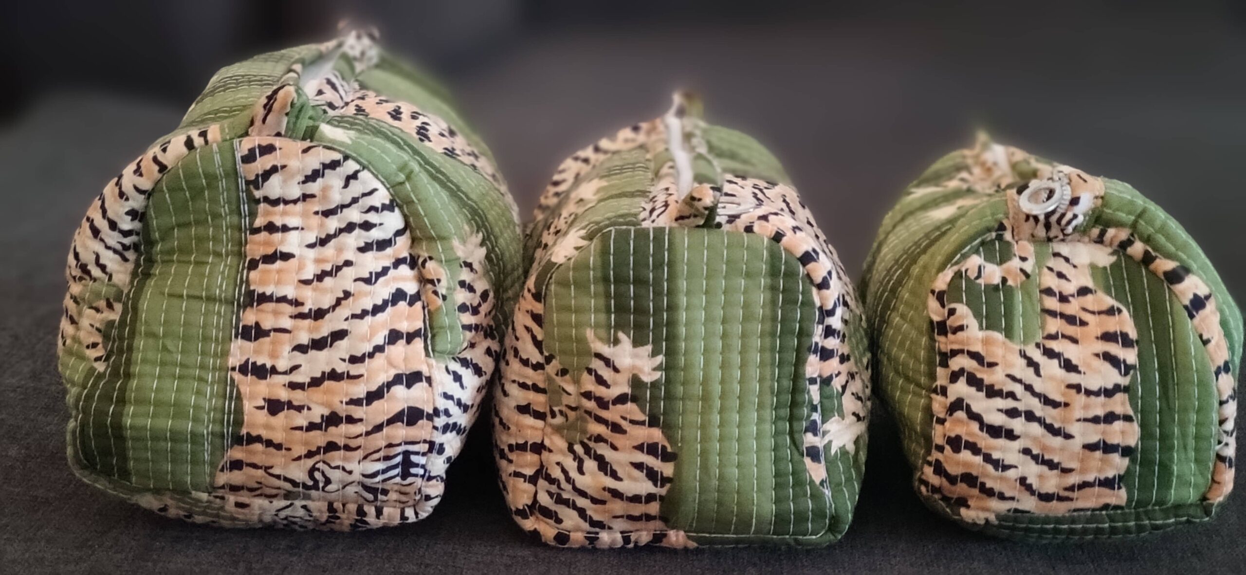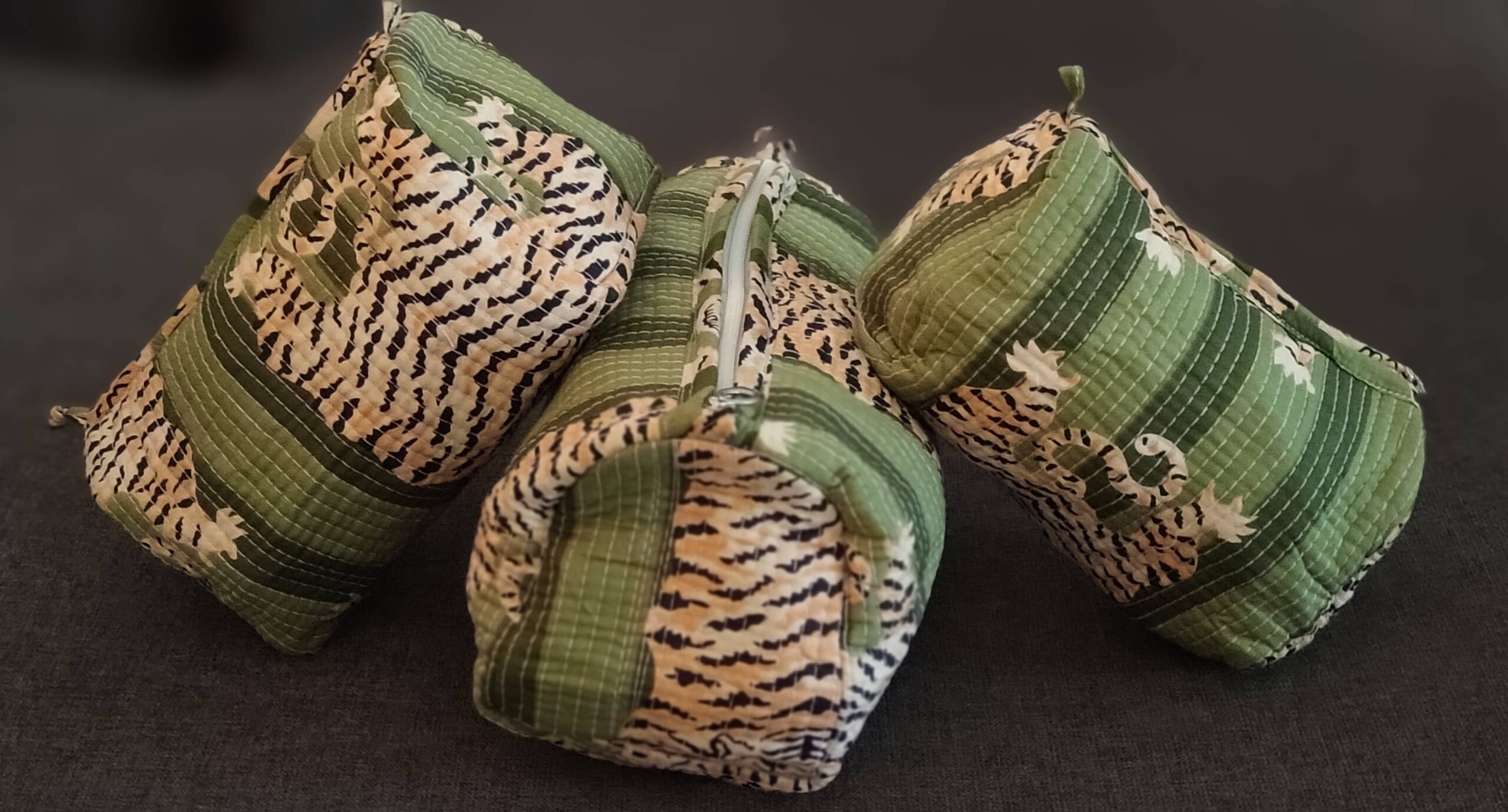 Add a bold yet elegant touch to your travel collection with our Green Tiger Quilted Cotton Pouch Set. Featuring hand-block-inspired tiger motifs on olive green stripes, this set combines functionality with artistic flair.