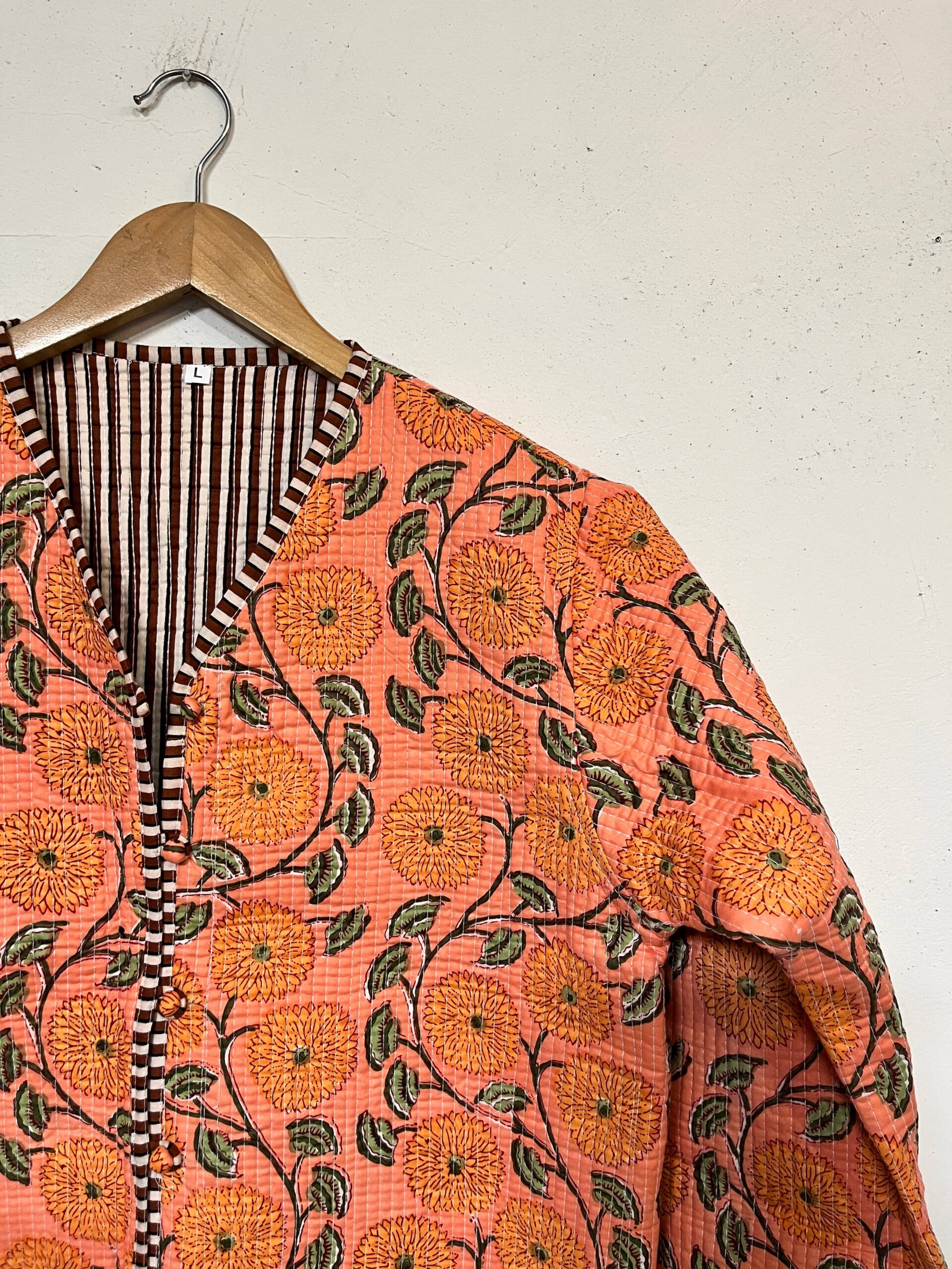 Bright and full of charm, our Ivera Reversible Cotton Jacket adds a pop of sunshine to any outfit. Handcrafted from soft quilted cotton, it features a vibrant floral print on one side and a bold striped pattern on the reverse, giving you two looks in one.
