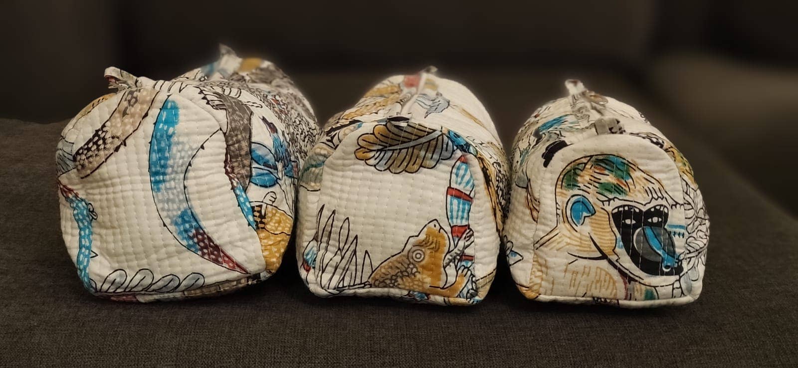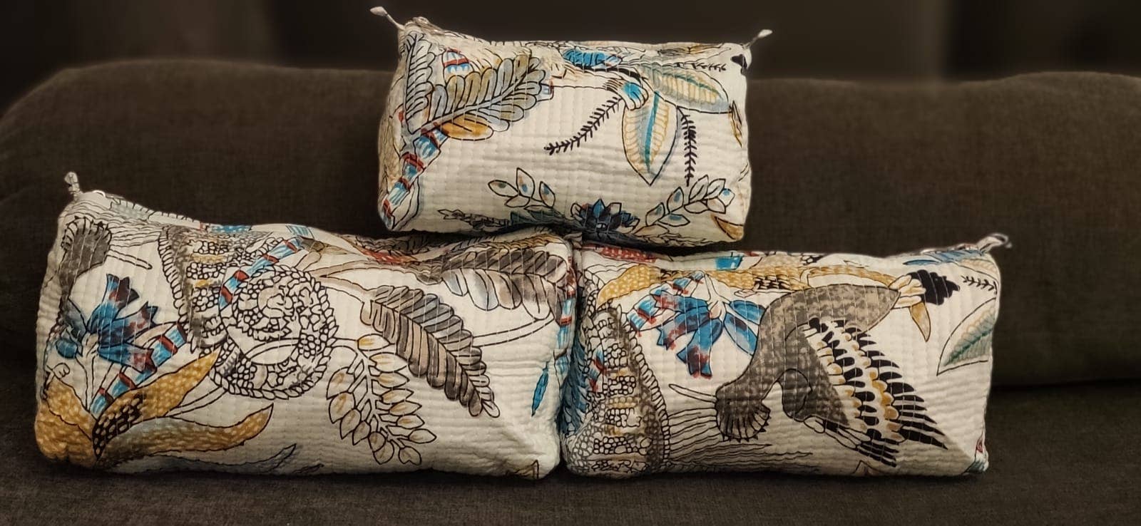 Made from 100% quilted cotton, each bag is padded for durability and lined for easy maintenance, ideal for organizing your beauty, skincare, or travel accessories. Available as a set of three or individually in large, medium, or small sizes.