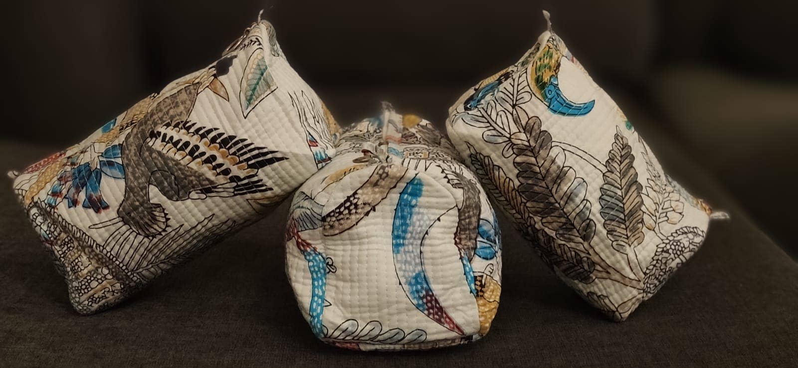 Understated and elegant, our Ivory Safari Quilted Cotton Makeup Bags feature a soft off-white base with printed flora and fauna in earthy greys, muted golds, and deep ocean blues. A perfect blend of natural charm and modern minimalism, these pouches bring sophistication to your everyday essentials.