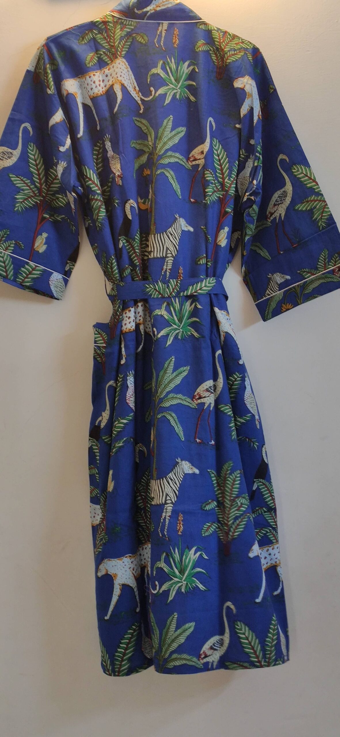 Step into effortless elegance with our Jungle Blue Cotton Kimono, featuring a vivid blue base adorned with exotic birds, zebras, and lush palm motifs. Crafted from soft, breathable cotton, this kimono is perfect for lounging, layering, or adding a tropical touch to your day.