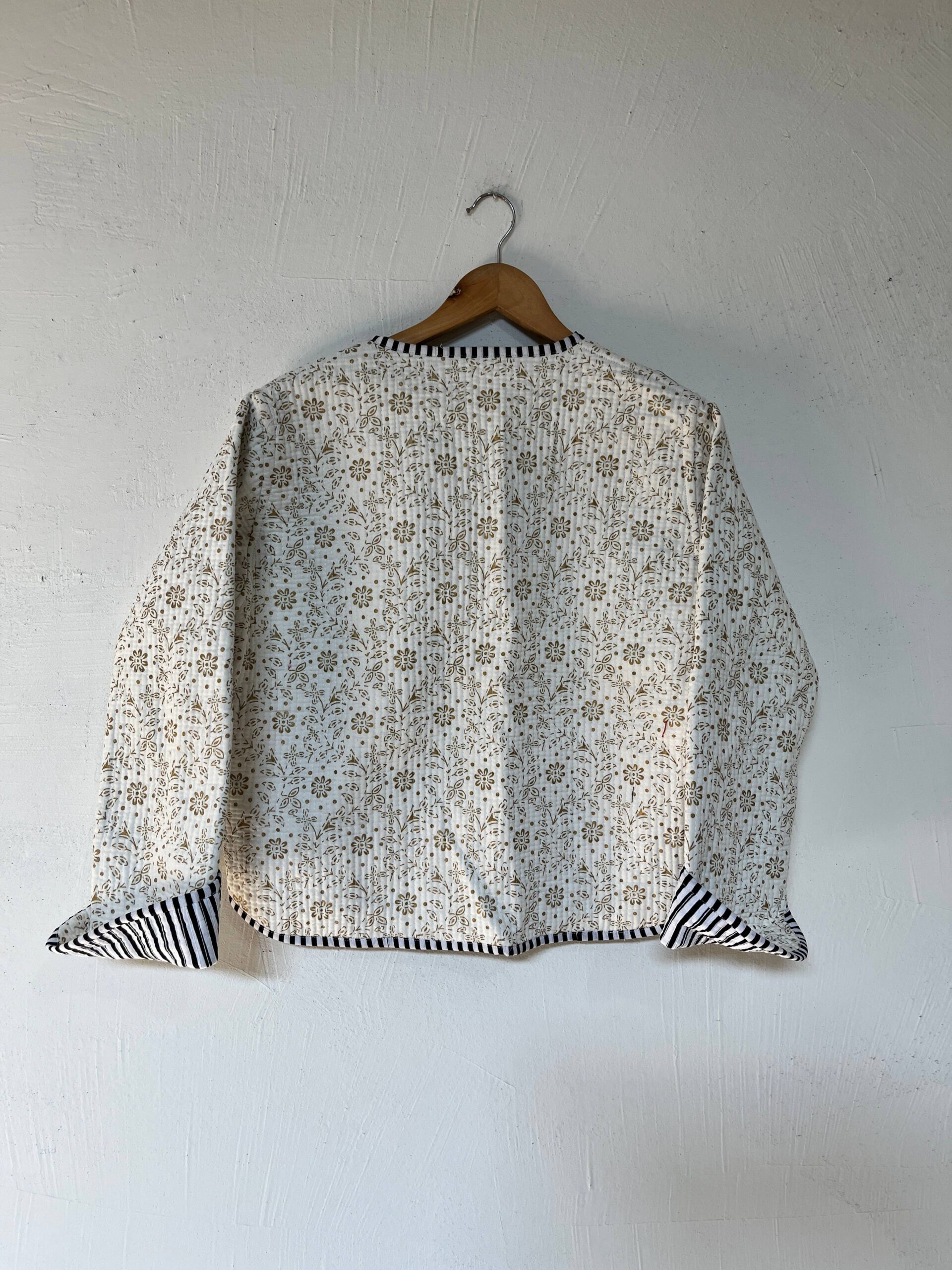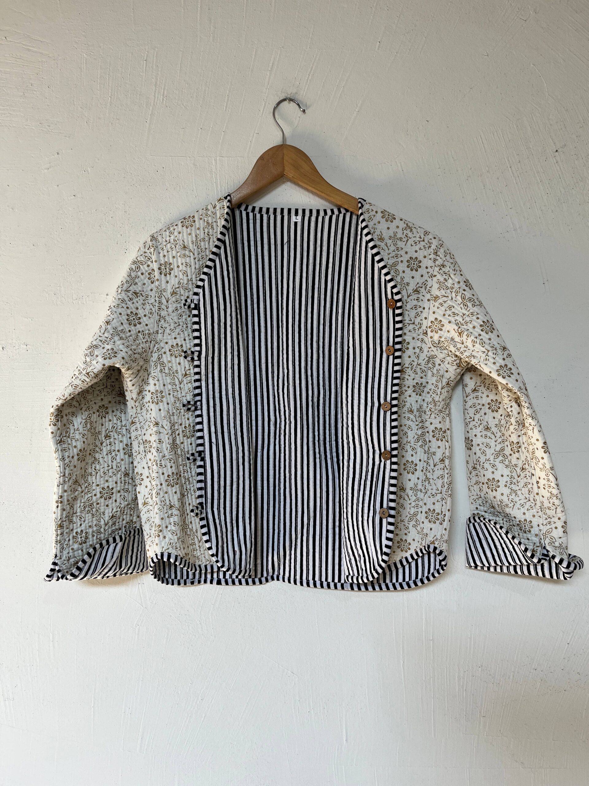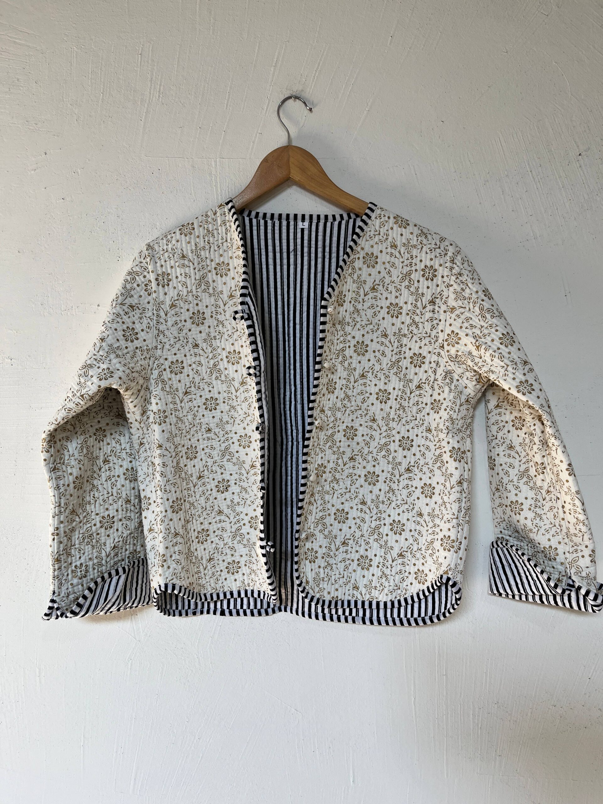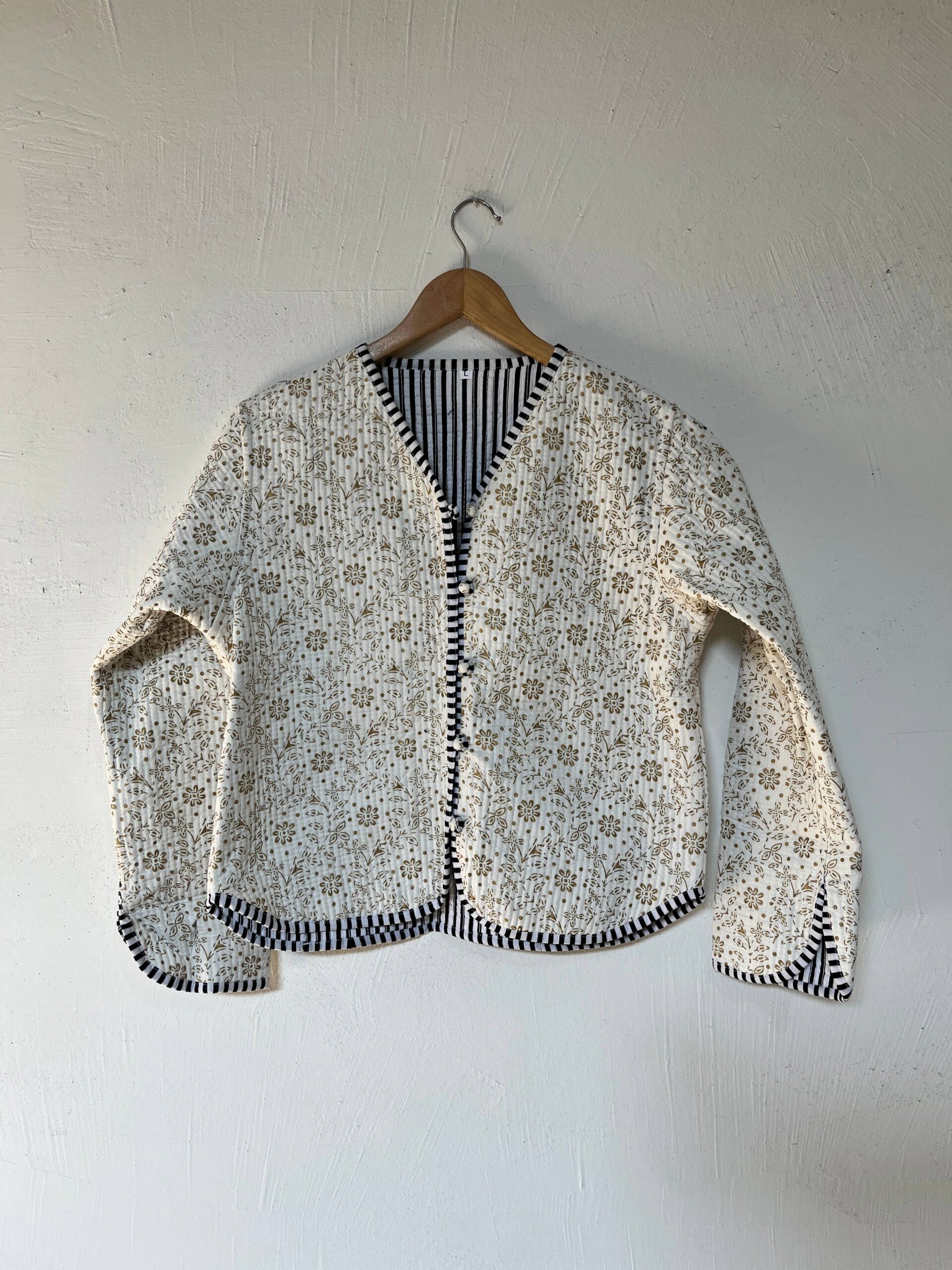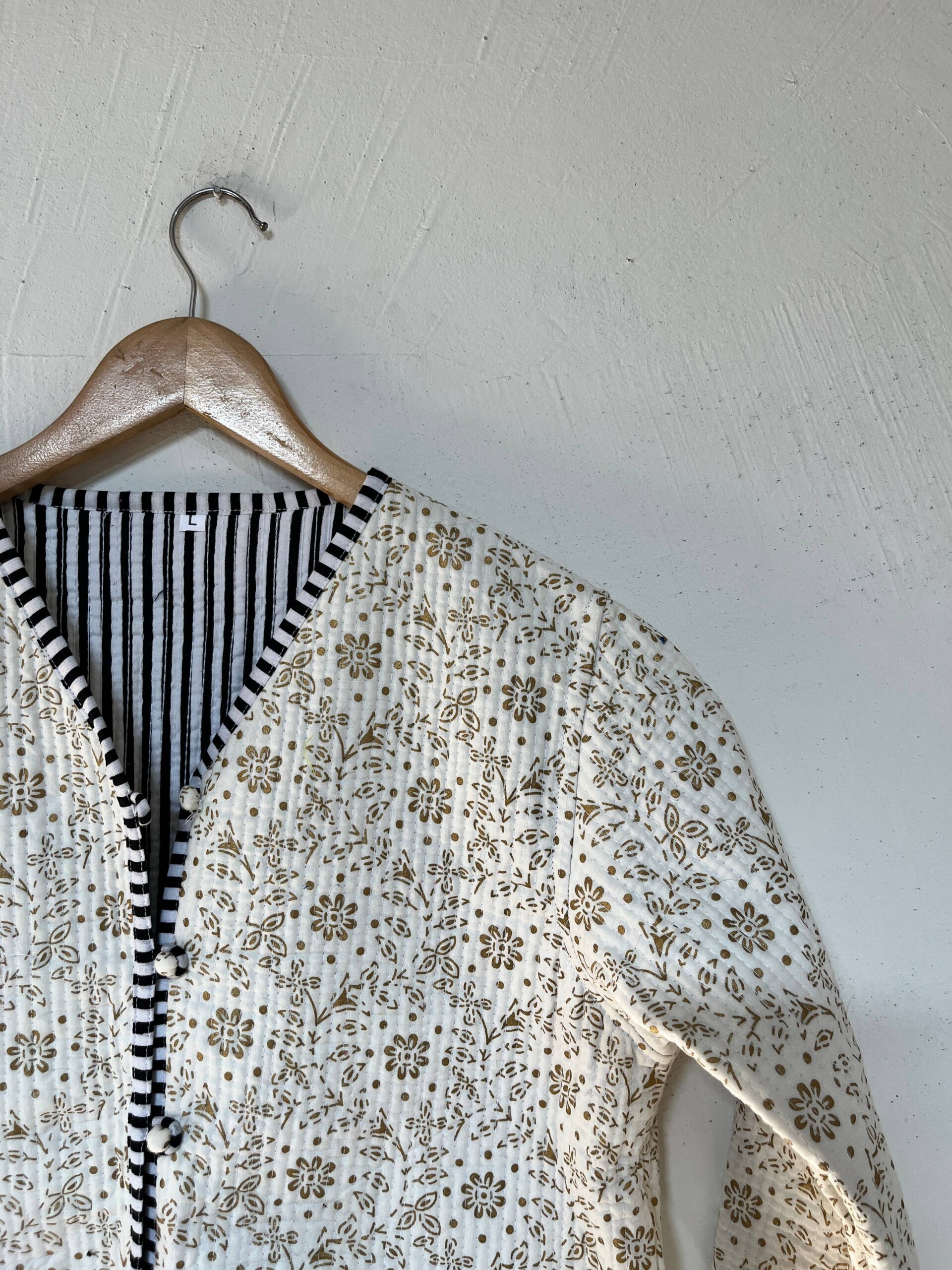 Effortlessly elegant, our Leafora Reversible Cotton Jacket is the perfect blend of comfort and charm. Handcrafted from soft quilted cotton, it features a delicate floral block print on one side and classic black-and-white stripes on the reverse, giving you two timeless looks in one piece.