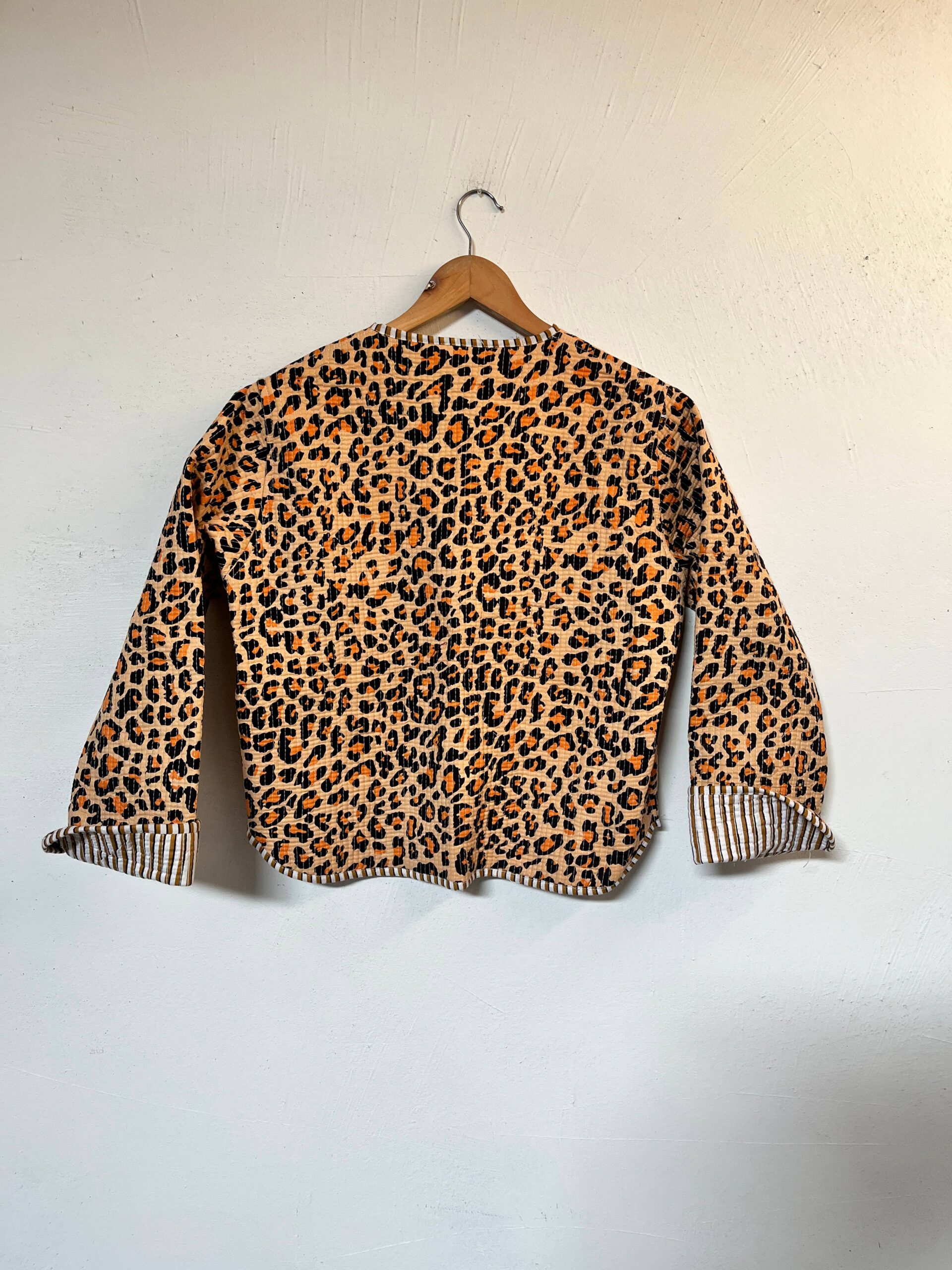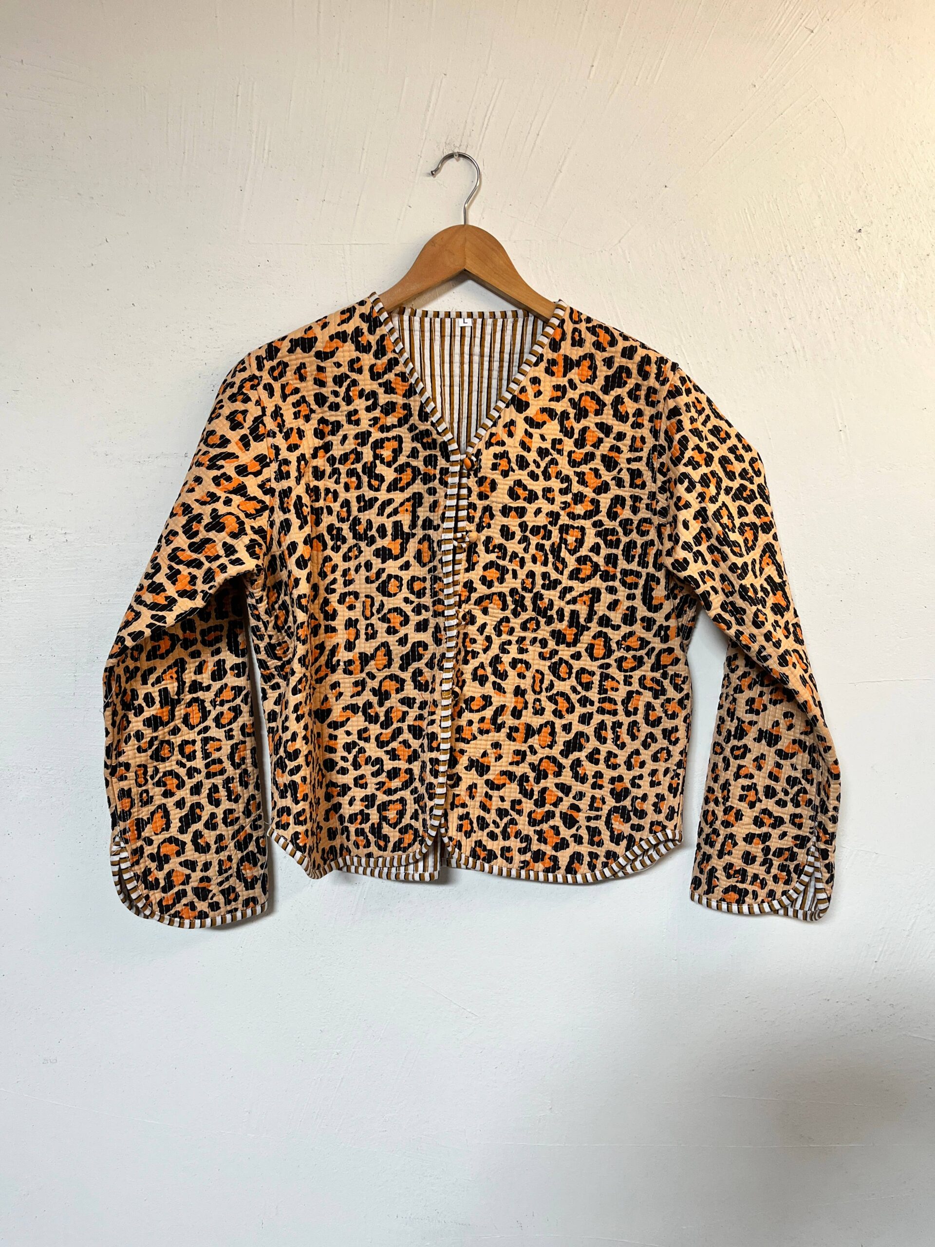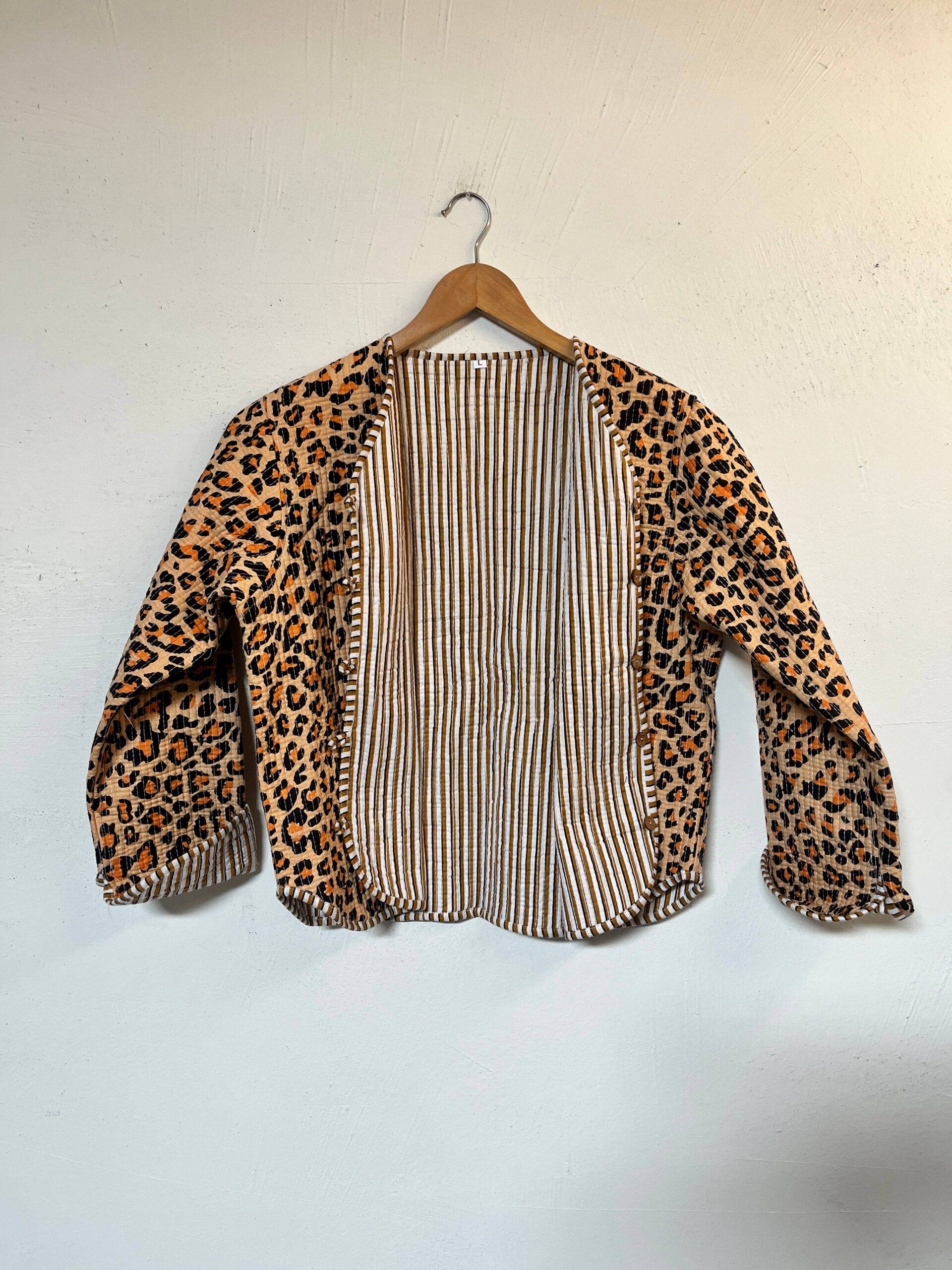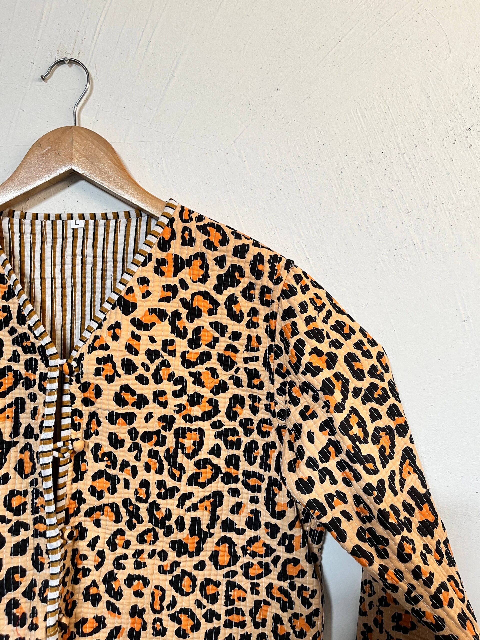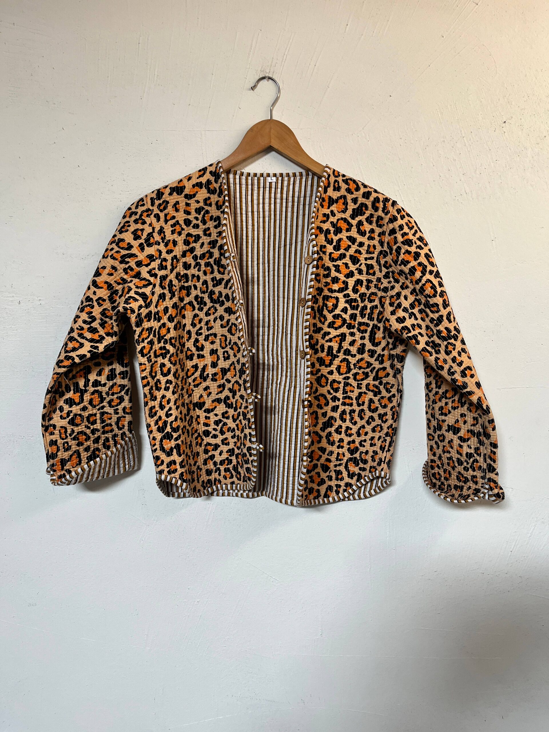 Turn heads wherever you go with our Leopard Reversible Quilted Cotton Jacket, a statement piece that’s as bold as it is versatile. Handcrafted from soft, breathable cotton, this jacket features a striking leopard print on one side and stripes on the reverse, giving you two effortlessly stylish looks in one.