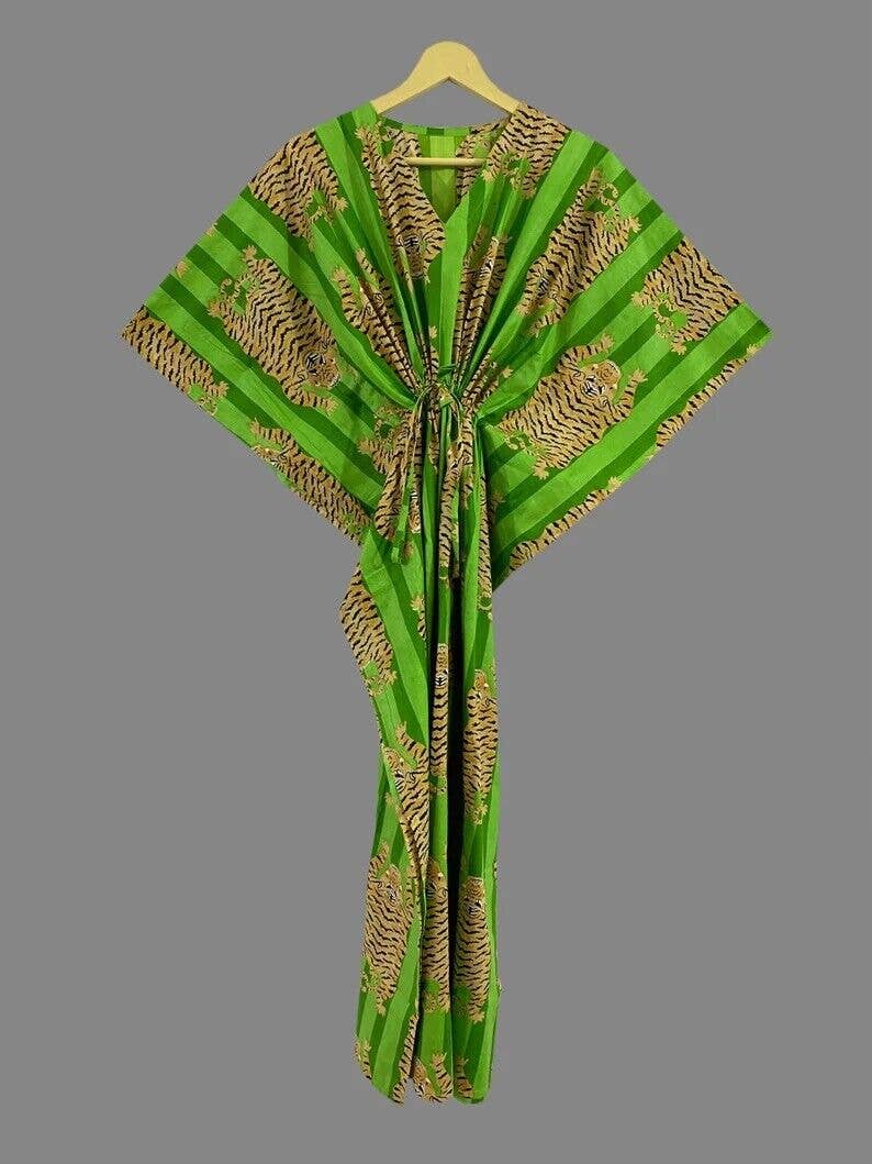 Unleash your wild side in comfort with our Neon Green Tiger Cotton Kaftan. Featuring a striking tiger print on a neon green base, this kaftan blends effortless style with relaxed elegance. Made from soft, breathable cotton, it’s perfect for lounging at home, beach getaways, or casual outings.