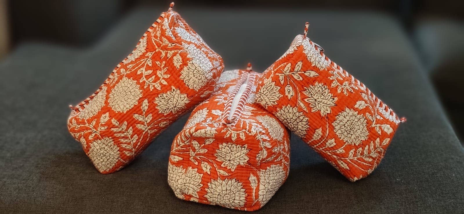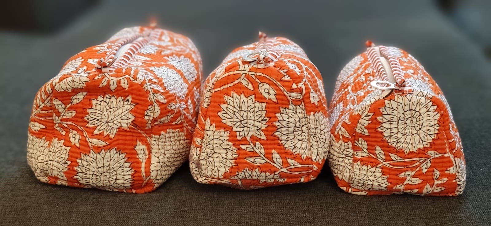 Add a burst of brightness to your routine with our Orange & White Print Cotton Quilted Makeup & Toiletry Bag Set.