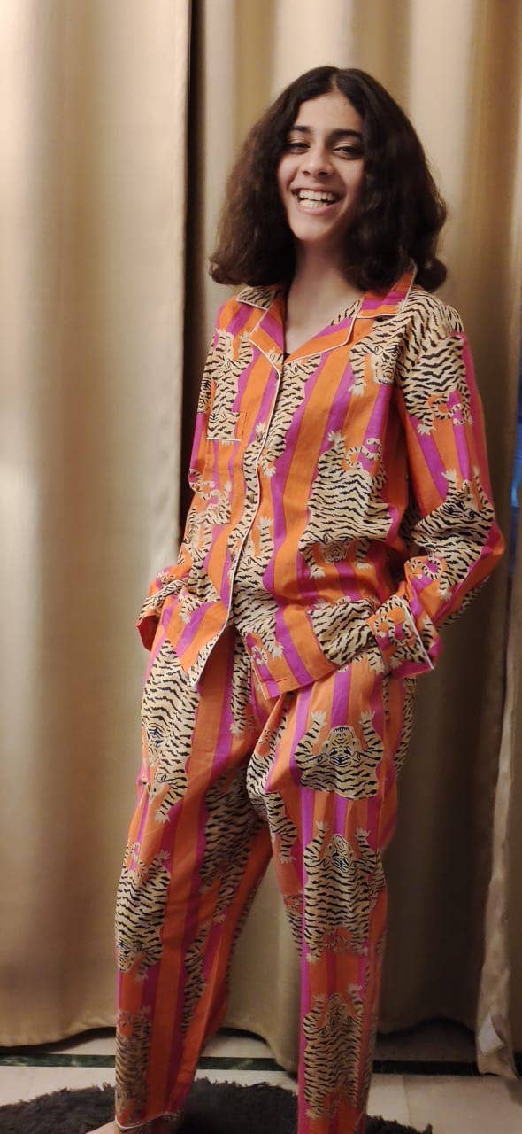 Sleep easy in our cotton printed PJ sets, made from breathable, lightweight cotton that feels soft against your skin. The full-sleeve shirt and elastic-waist pants offer the perfect blend of comfort and ease, complete with handy pockets and a matching fabric bag.