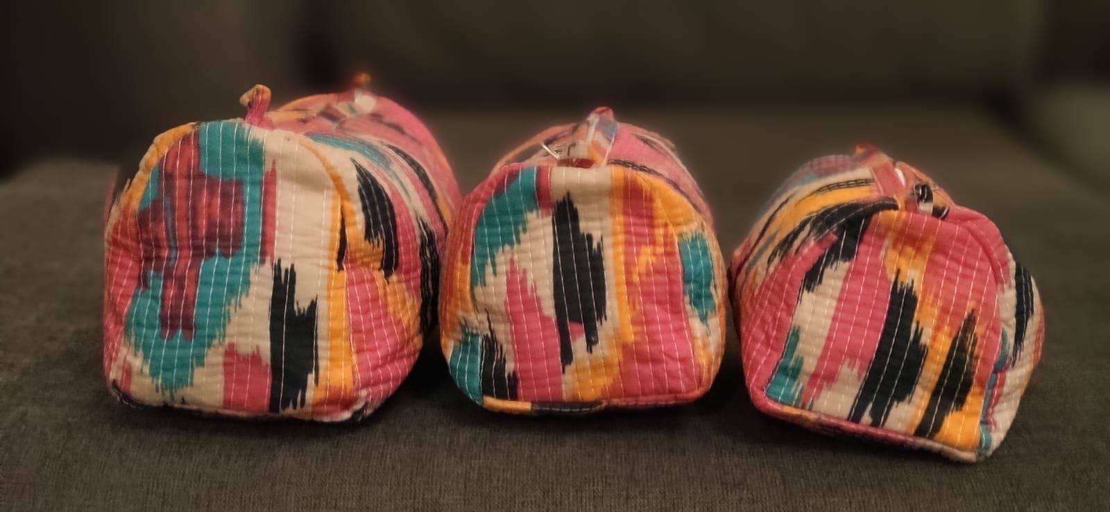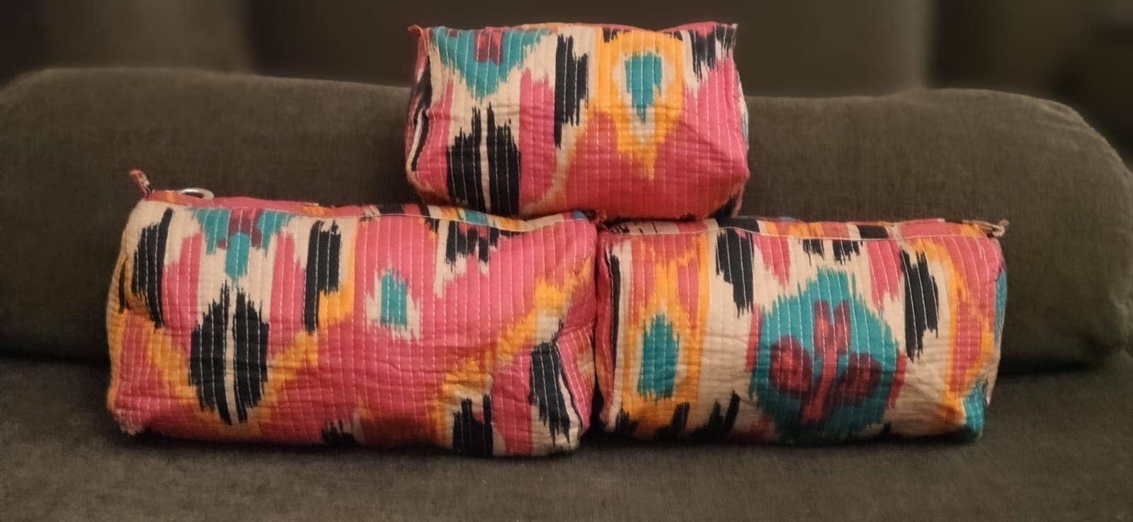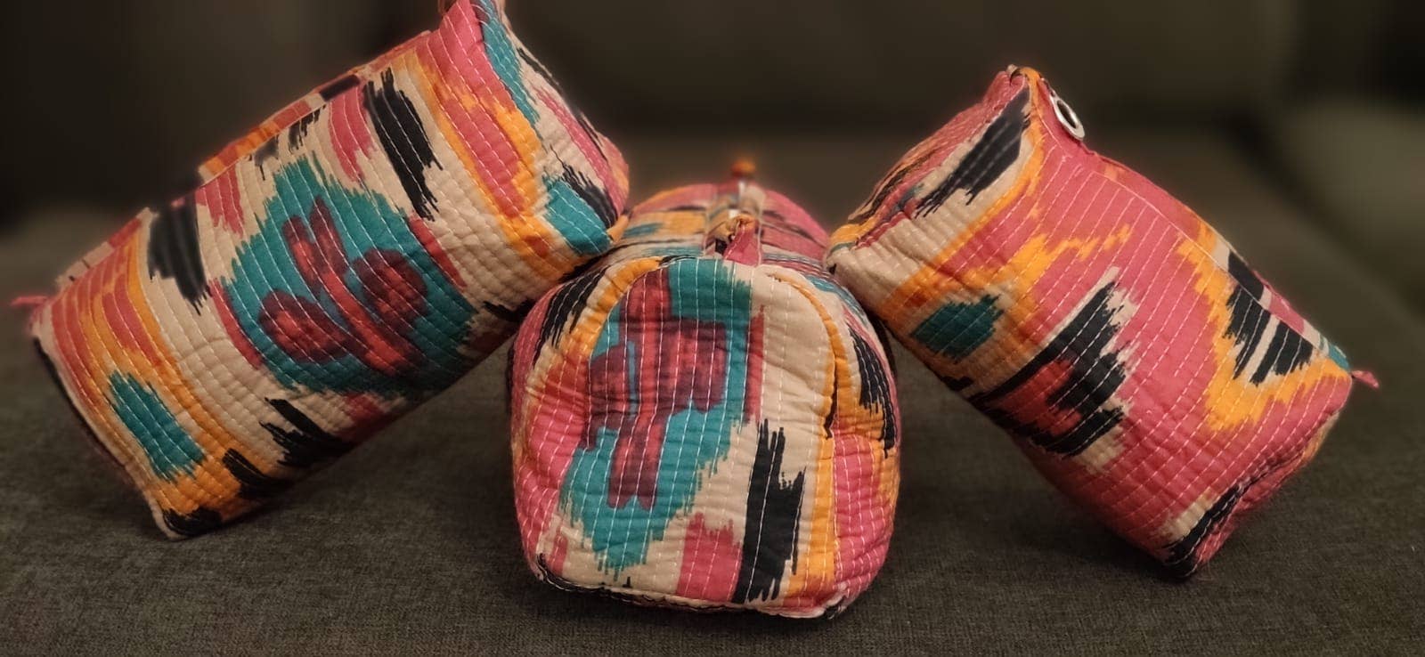 A burst of color and craftsmanship, our Pink Ikat Quilted Cotton Makeup Bags are a celebration of bold patterns and traditional artistry. Handcrafted in soft quilted cotton, these bags feature a lively Ikat-inspired print in shades of pink, teal, mustard, and black, adding instant vibrance to your vanity or travel collection.
