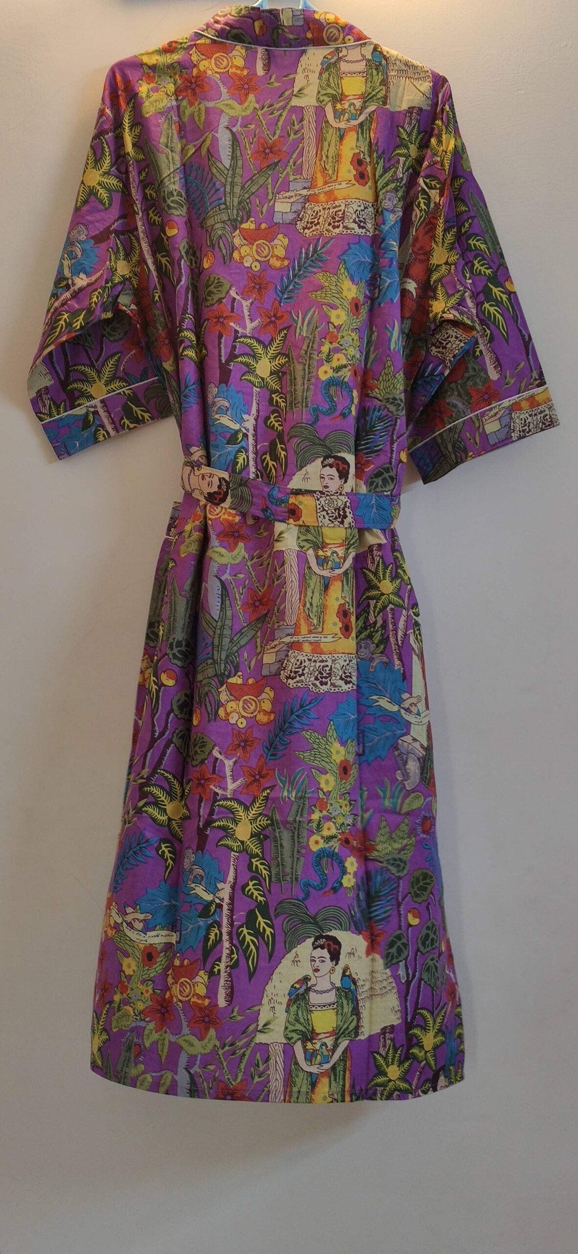 Inspired by the spirit of art and color, our Purple Frida Cotton Kimono celebrates creativity and individuality. Featuring a vivid print of Frida surrounded by lush tropical motifs, this kimono is a wearable piece of art.