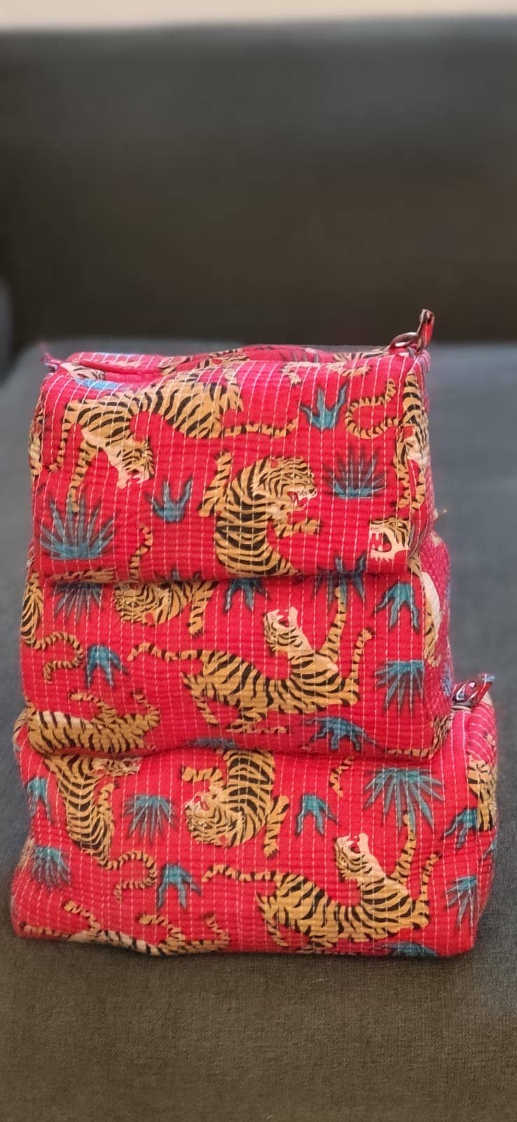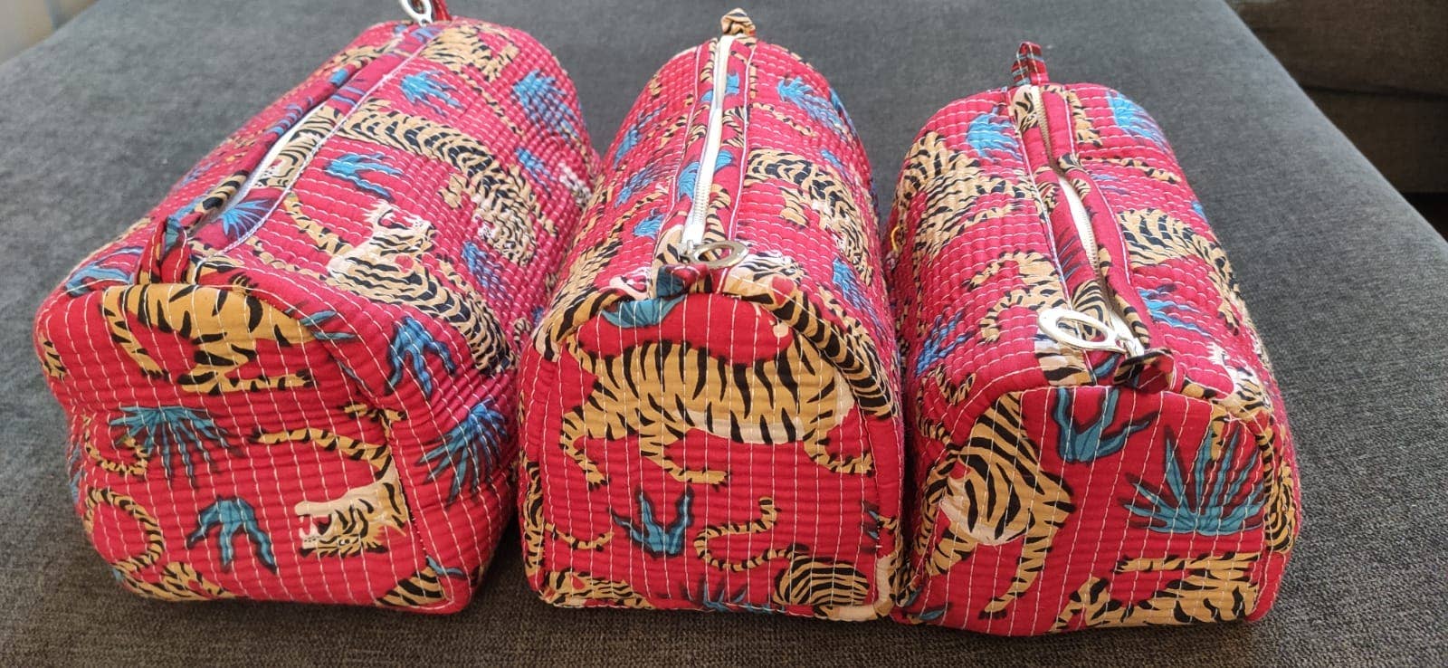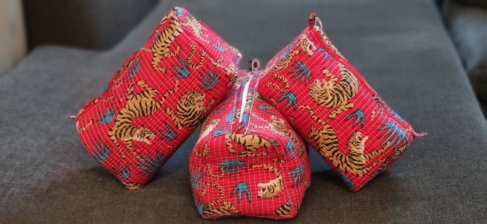 Vibrant and fierce, our Red Safari Tiger Quilted Cotton Makeup Bags bring the wild to your vanity. Featuring bold printed tigers playfully set against a rich red backdrop with hints of teal foliage, these pouches are a perfect blend of energy and craftsmanship.