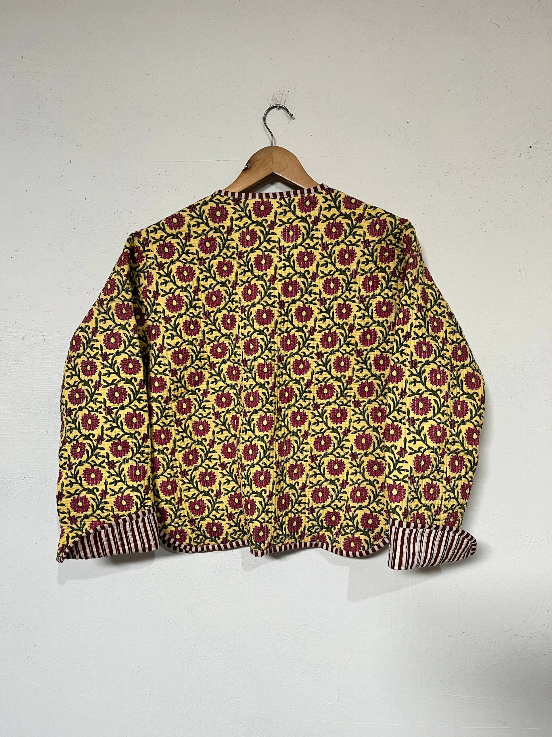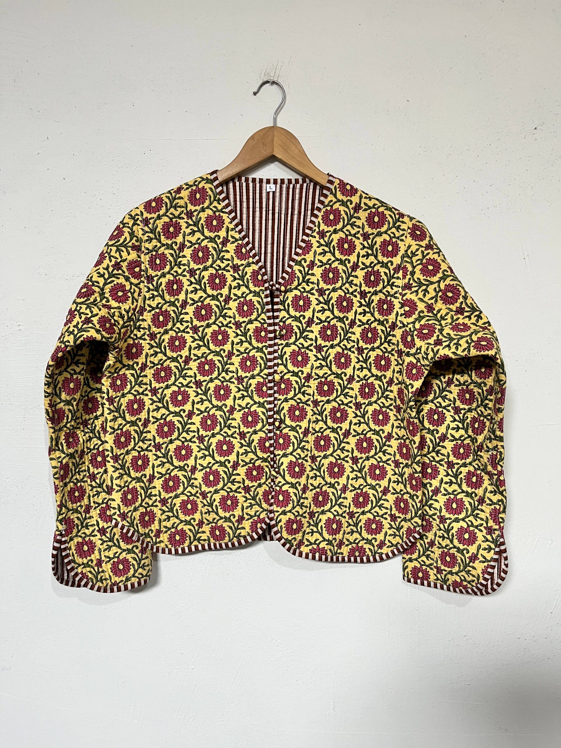 Crafted from high-quality cotton, our reversible quilted jacket has two front pockets, and handmade cotton buttons. The jacket is fully reversible, featuring a solid color/striped fabric on the inside, allowing you to switch up your look depending on your mood or outfit.