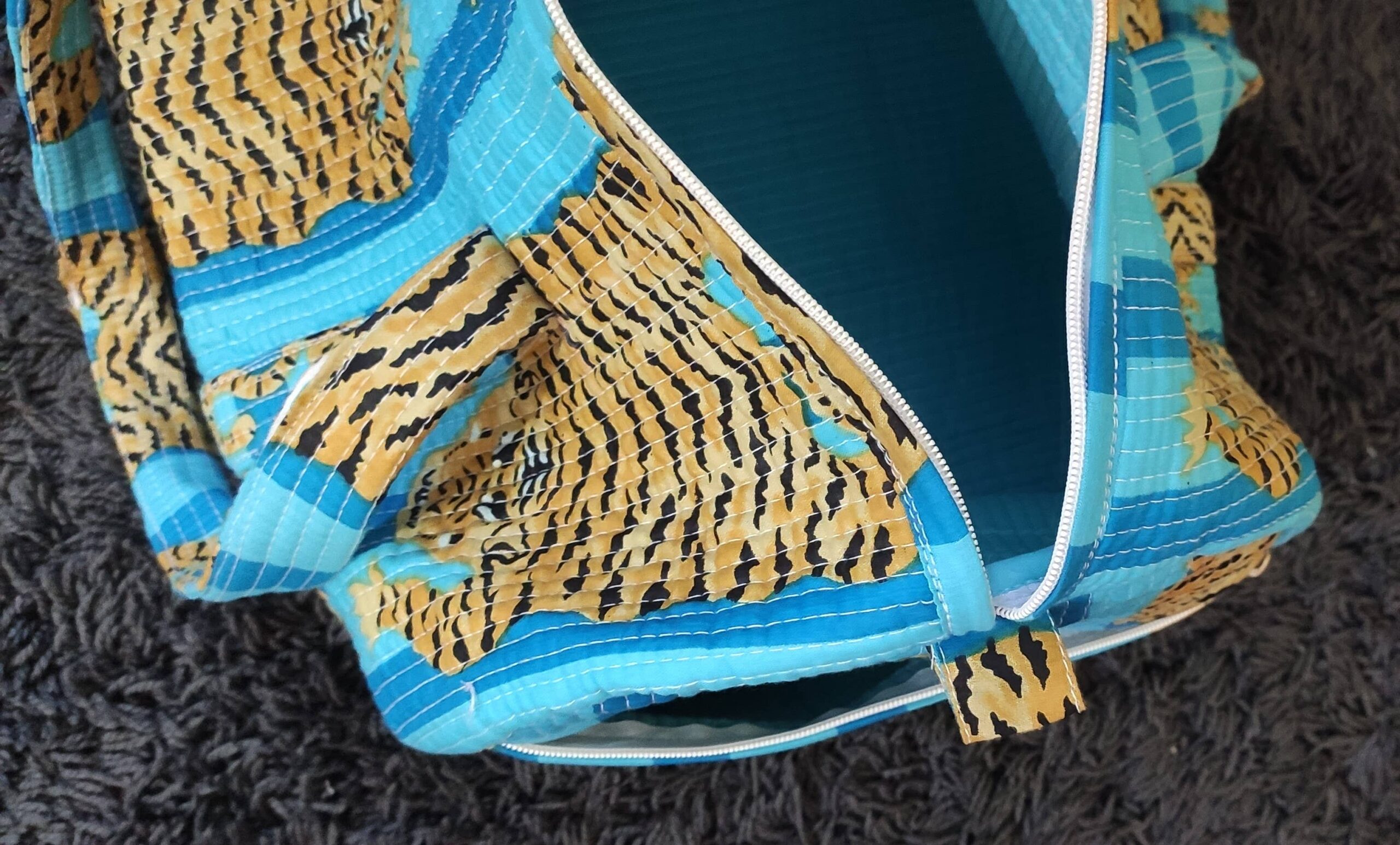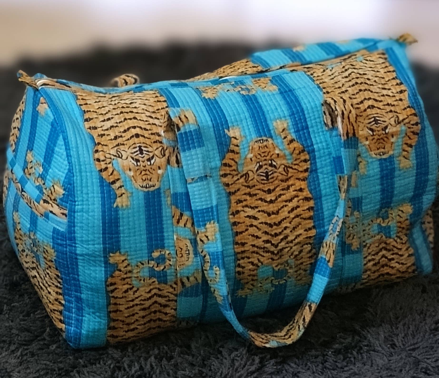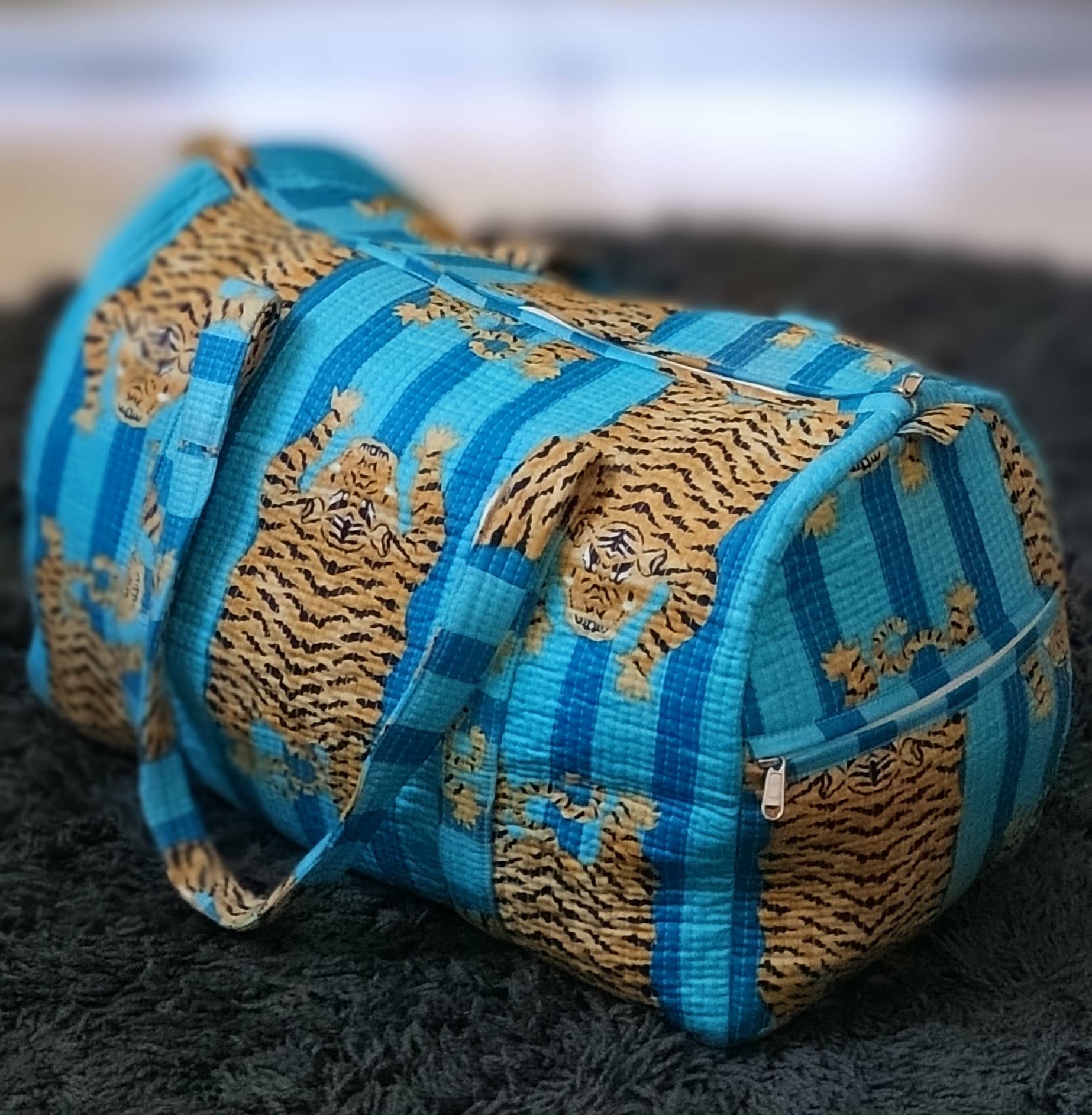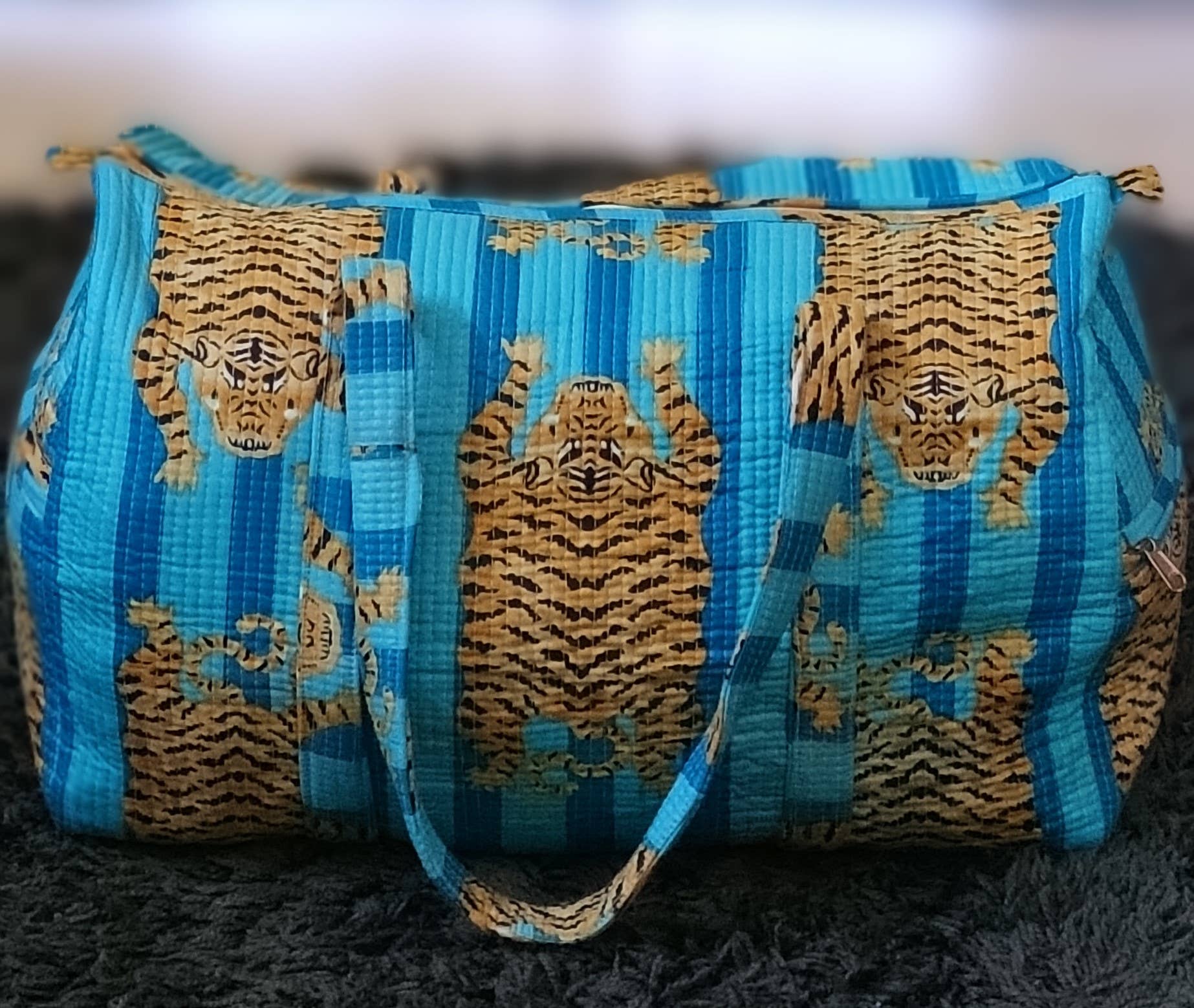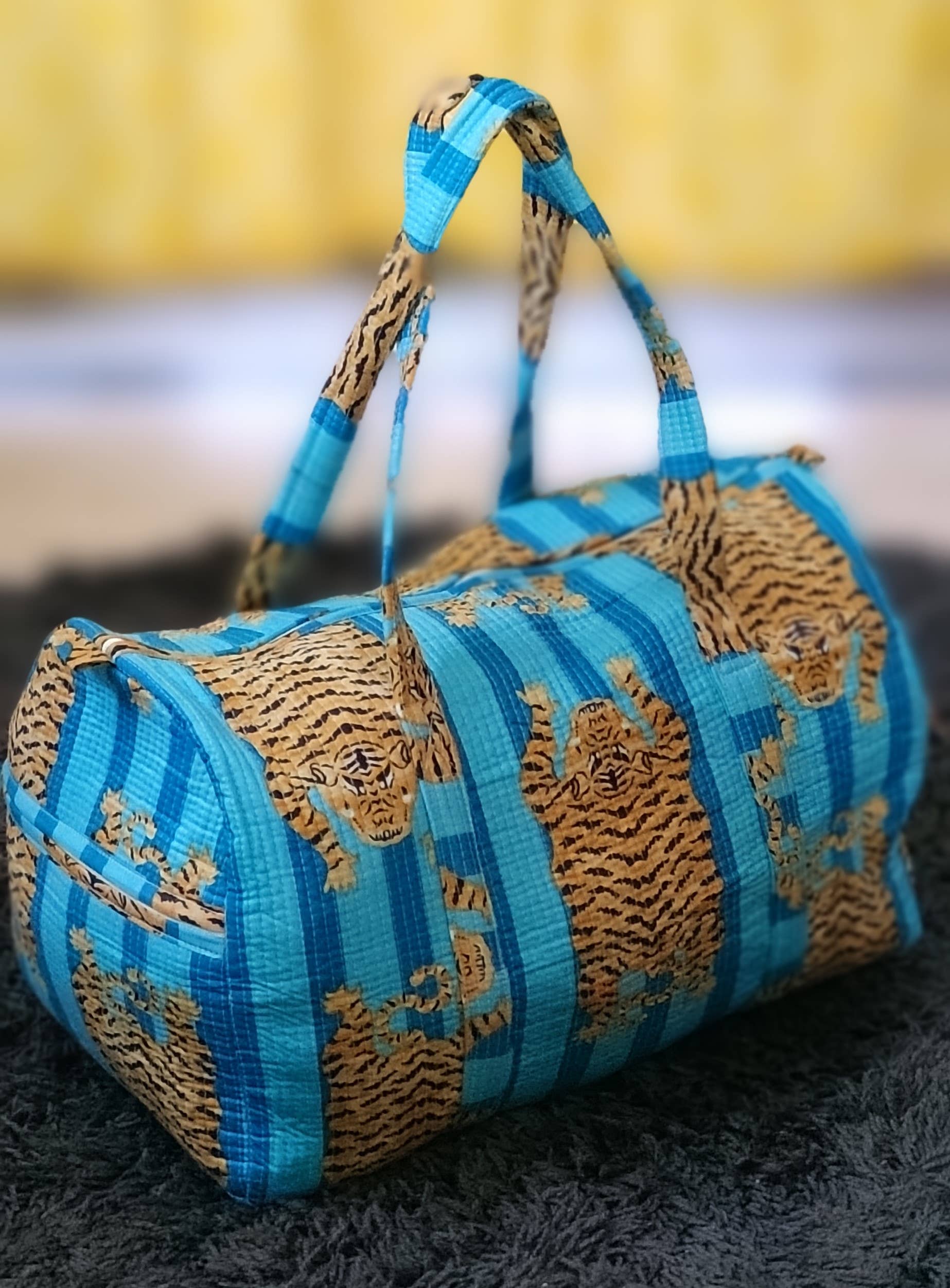Add a bold, handcrafted touch to your travels with our Turquoise Blue Tiger Quilted Cotton Duffel Bag. Featuring vibrant turquoise stripes with striking tiger motifs, this quilted duffel perfectly balances playfulness and practicality. Made from 100% cotton and softly padded for structure, it’s roomy enough for weekend getaways or gym essentials.