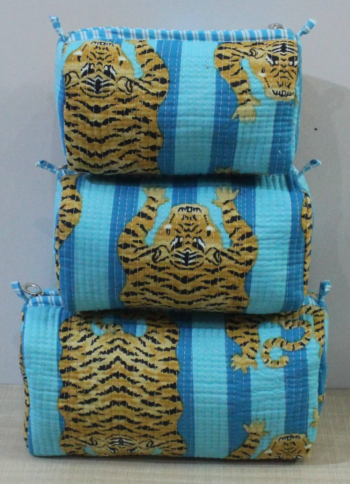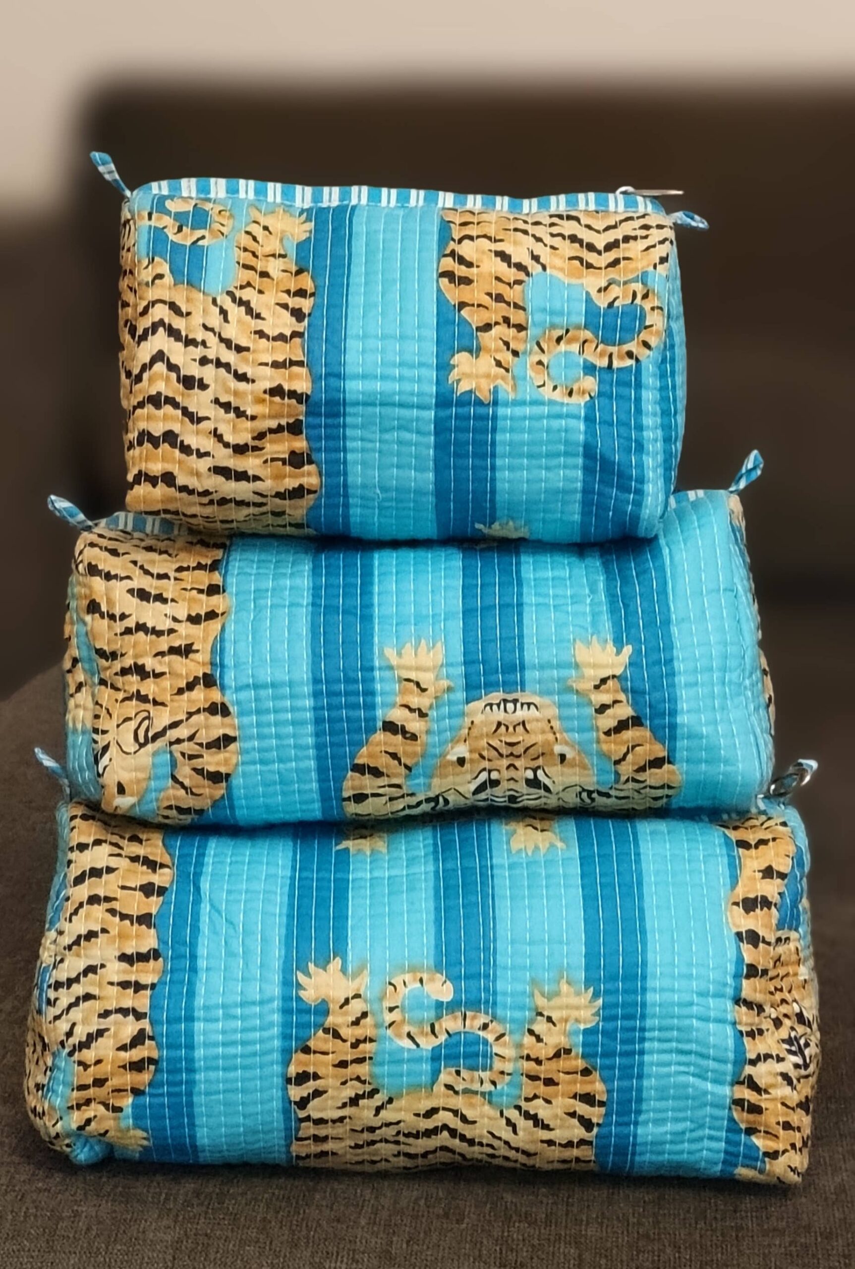 Bold, fierce, and full of character, our Turquoise Tiger Quilted Cotton Makeup Bags bring wild elegance to your everyday essentials. Featuring striking tiger motifs on vivid turquoise blue, this handcrafted design celebrates strength and style in perfect balance.