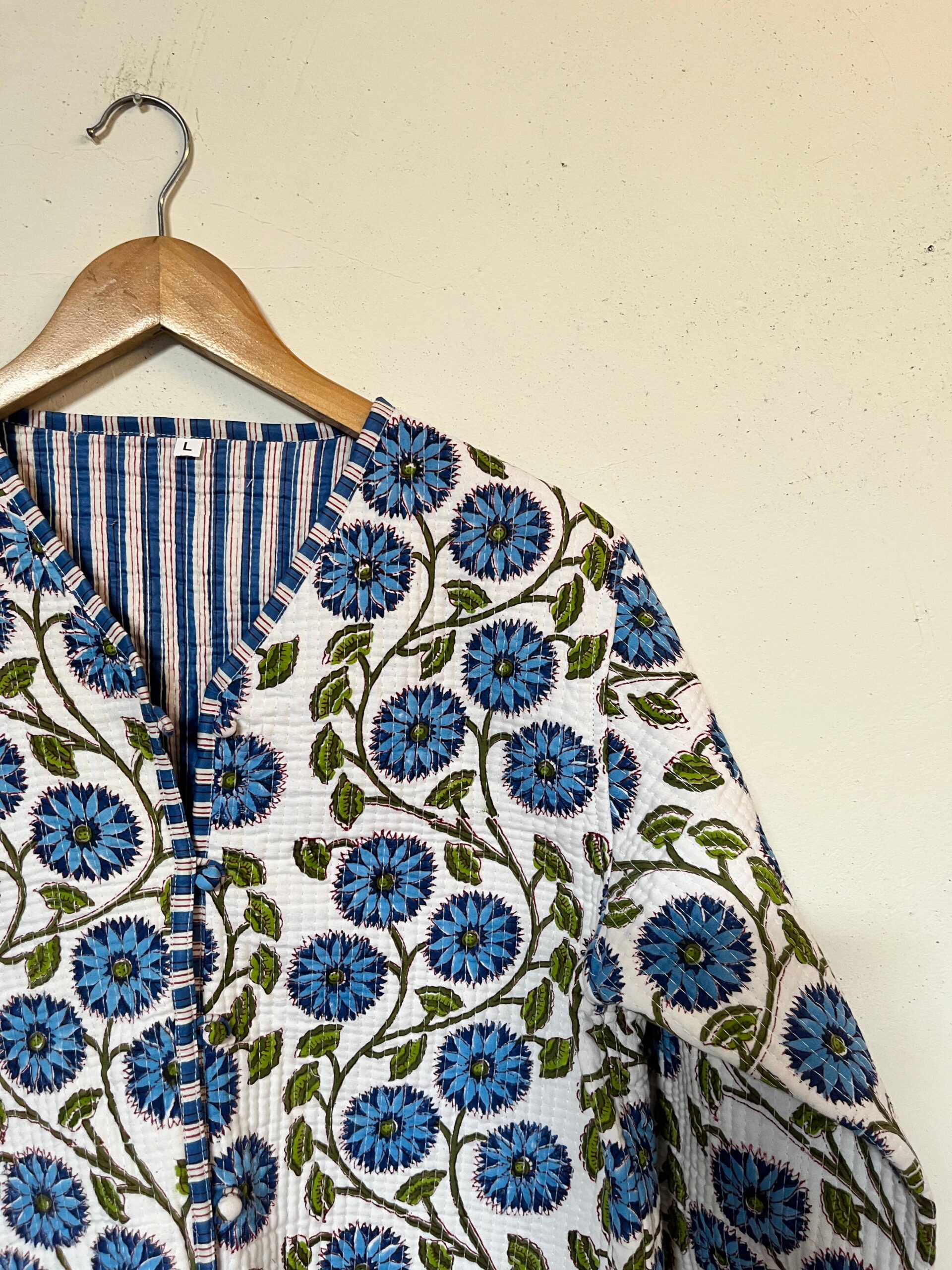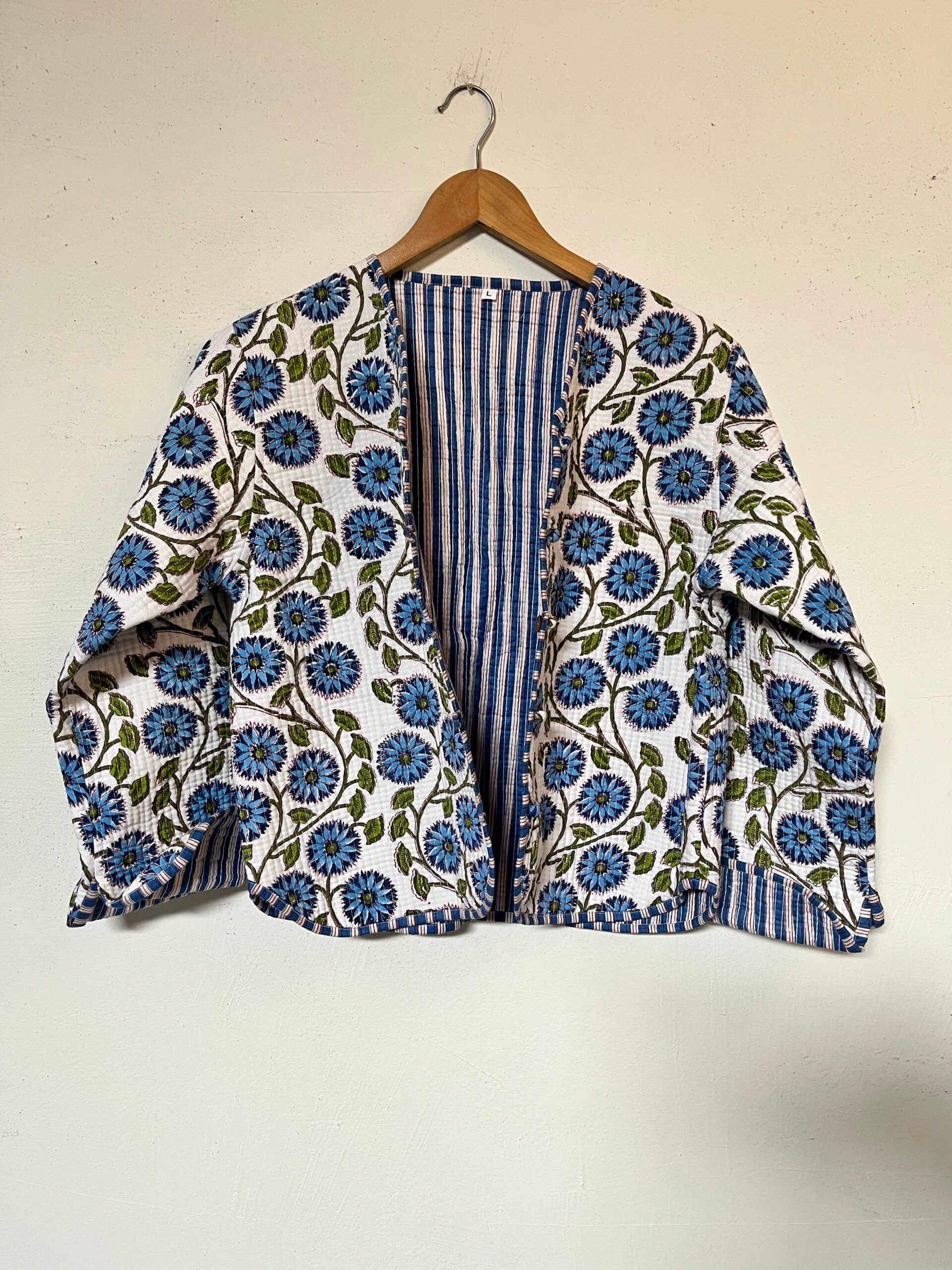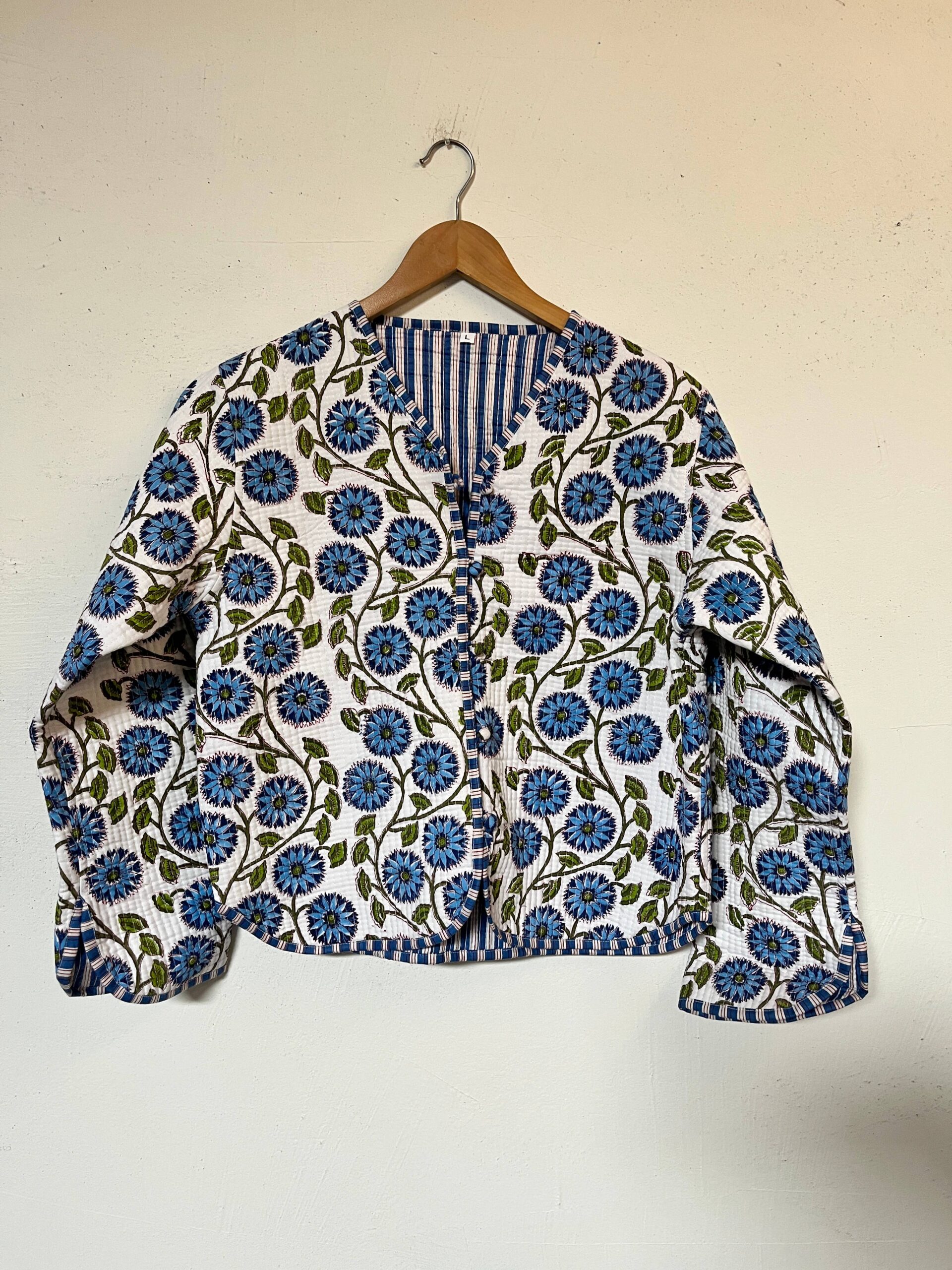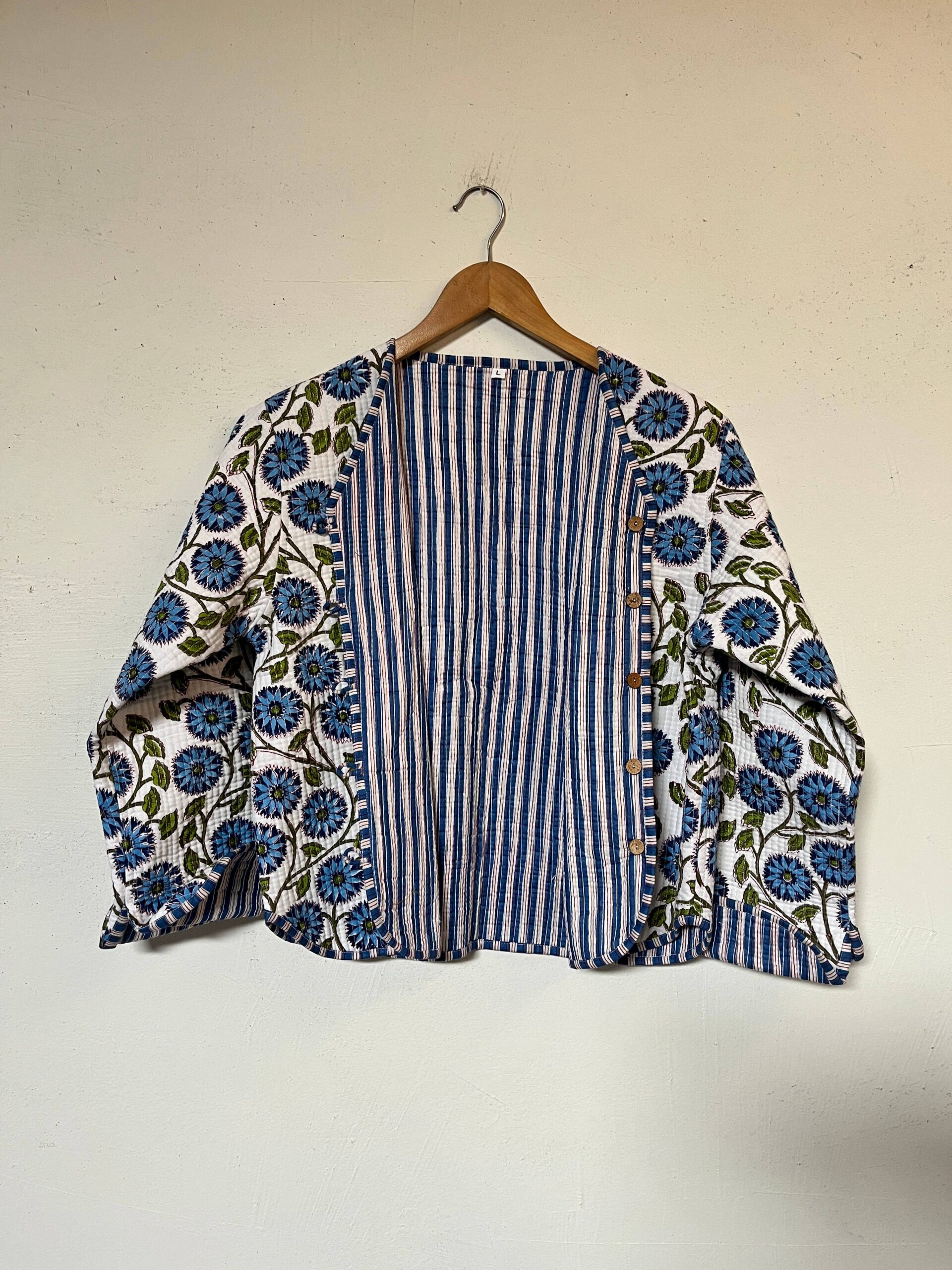 Crafted from high-quality cotton, our reversible quilted jacket has two front pockets, and handmade cotton buttons. The jacket is fully reversible, featuring a solid color/striped fabric on the inside, allowing you to switch up your look depending on your mood or outfit.