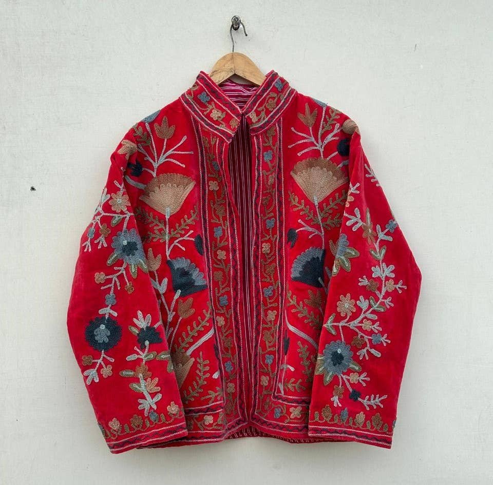 Be the first to review “Velvet Suzani Hand Embroidered Jacket – Red”